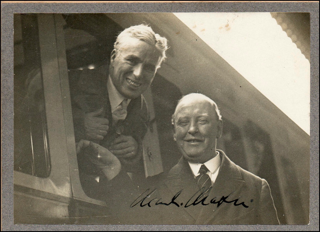[Film Icons] Chaplin, Charlie. (1889-1977). Signed Photograph . Signed sepia-toned matte finish image of Chaplin with his friend Jack Fitchett. 6.5 x 4.5 inches, dry mounted to solid mount board with a bevelled edge, else fine.