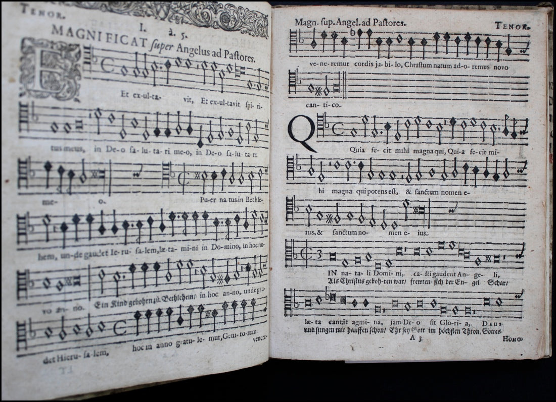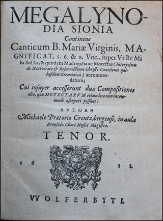 Praetorius, Michael. (1571 - 1621). Megalynodia Sionia - FIRST EDITION. Megalynodia Sionia, continens anticum B. Mariae Virginis, Magnificat, 5.6. & 8. voc.super Ut Re Mi Fa Sol La ,& quaedam madrigalia ac motectas (interpositis de Nativitate & Resurrectione Chrsti cantilenis quibusdam germanicus) accommodatum; cui insuper accesserunt duae compositions aliae, quae motectarum etiam loco non incommode usurpari possunt. [Tenor part.] Wolferbyti [the Author], 1611. First edition [34]ff. + [1] errata page. Bound with: Another liturgical work of sixty pieces, without title-page, which includes the composer’s ‘Puer natus in Bethlehem.’ The volume starts with ‘II. Bendicamus Domino’ above which is an ornate head-piece that is larger and certainly more prominent than the others throughout the volume, suggesting that it is possibly the first piece in the volume. It is interesting to note the colophon on the final leaf is set out and spelt differently: ‘Wulfferbyti, In Officina Typographica Principali Brunsvicens: Sumtibus Autoris,’ [ca. 1611]. 22ff..
