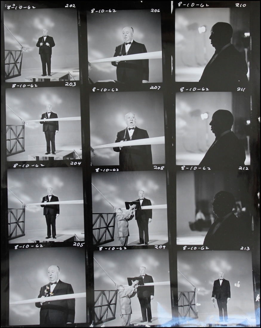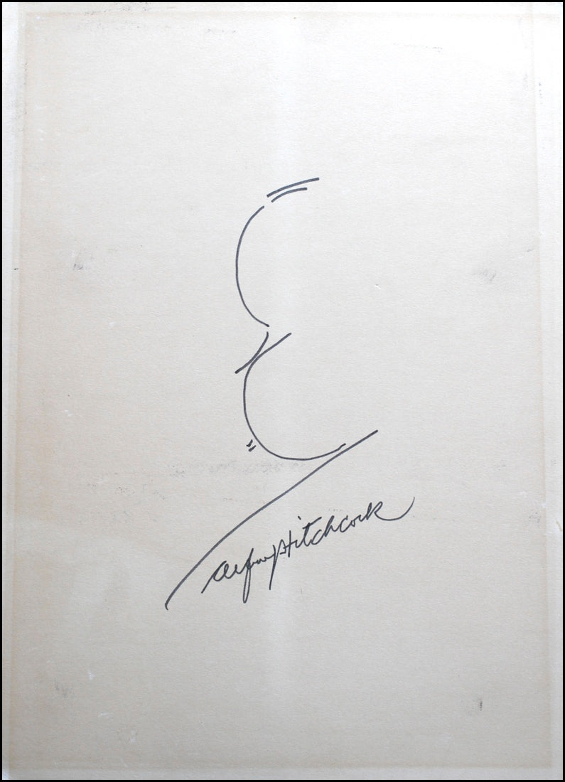 Large original black felt tip self-portrait sketch of his famous profile, boldly penned on an 11 x 14 piece of heavy artists’ board, signed “Alfred Hitchcock.” In fine condition with overall toning, a few minor scuffs and corner dings. Together with an original contact sheet, 8 x 10 inches, from an episode of the Alfred Hitchcock Hour.
