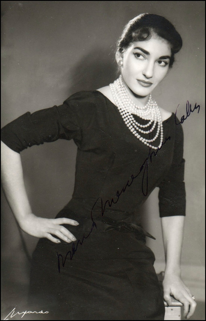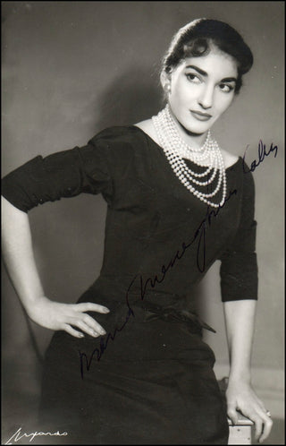 Stunning original Luxardo photograph, signed in black ink by Callas with her name alone across the image, "Maria Meneghini Callas." A very fine example of this famous image of La Divina at her most glamorous. 9.5 x 15 cm.