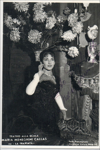 Original Erio Piccagliani photograph of Callas as Violetta in the 1955 Luchino Visconti La Scala production of Verdi's "La Traviata," signed and inscribed in purple ink. 10 x 14.5 cm. The inscription over a dark area of the image with only medium contrast, but overall in fine condition.