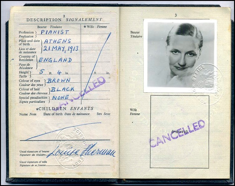 An unusual piece of ephemera from the celebrated Greek pianist. Bachauer's British passport, 32 pages recording her many travels, two upper cover corners clipped, a few pages diagonally stamped 'CANCELLED.' Issued in her name "Mrs. Louise Sherman," with the notation added "Professionaly known as Gina Bachauer," and with her rather vampish ID photograph and autograph signature.