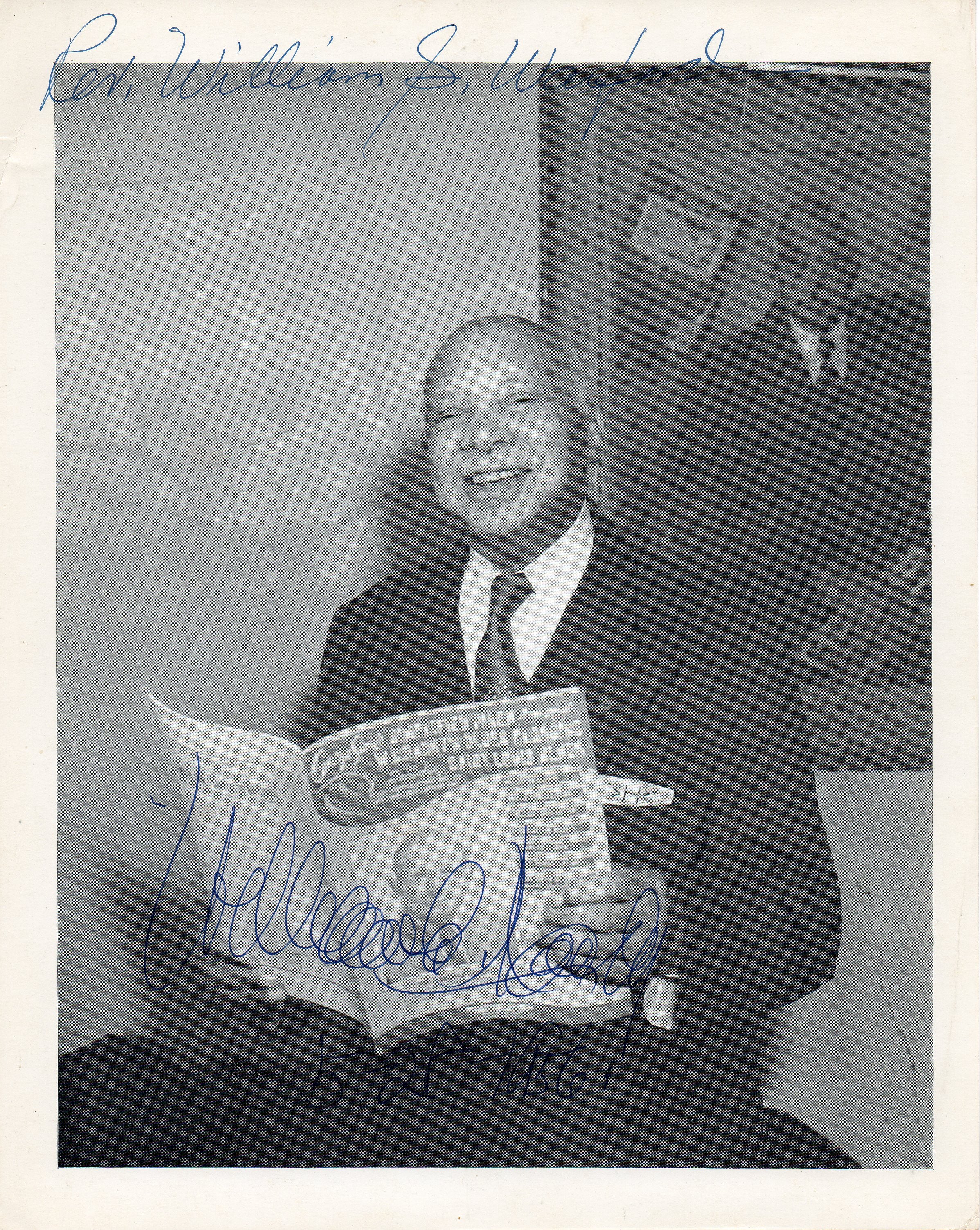 8 x 10 inch cardstock photograph of the pioneering African-American musician known as the ‘Father of the Blues,’ who wrote such hits as ‘Memphis Blues’ and ‘St. Louis Blues.’ Handy is shown smiling broadly and holding a piece of his own sheet music and has boldly signed and inscribed in blue ink and dated 1956. In fine condition.