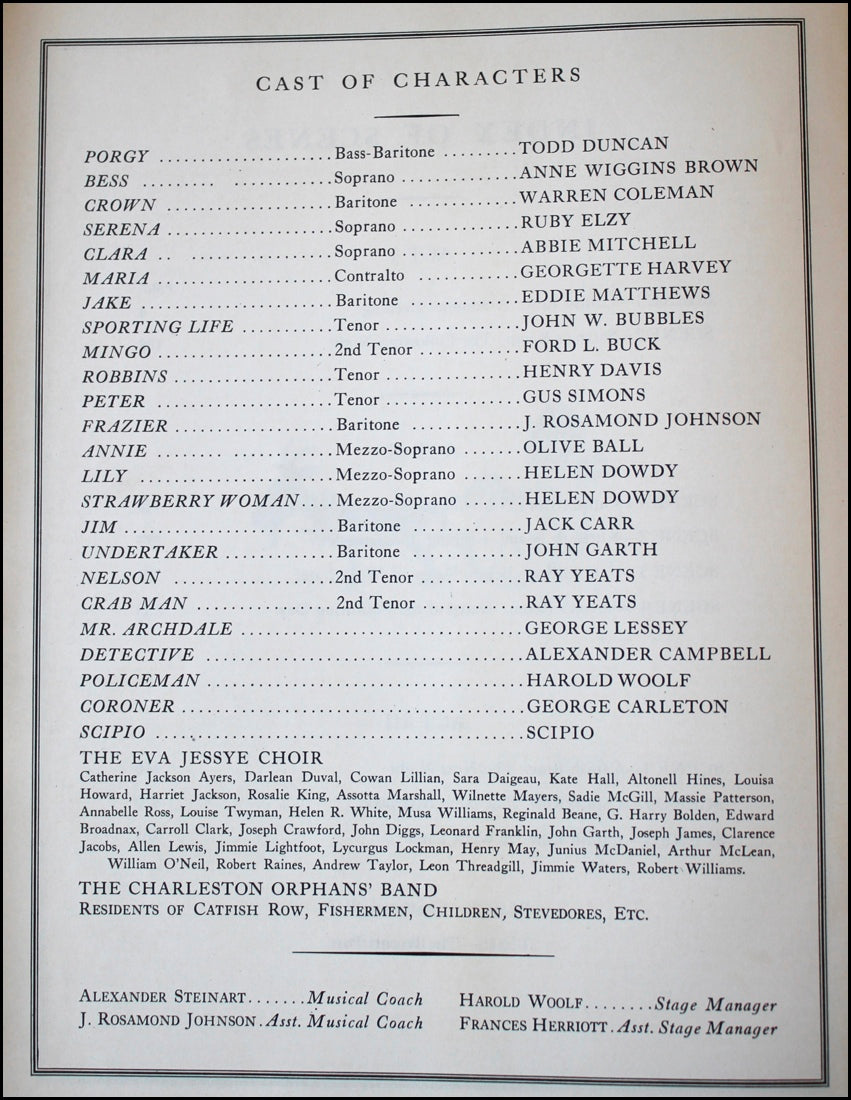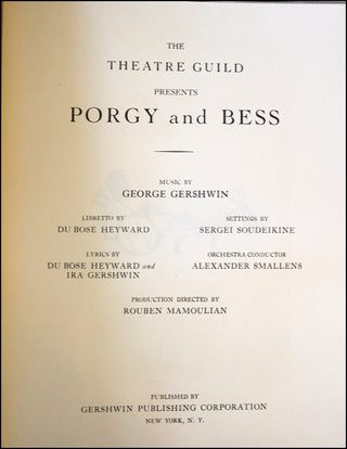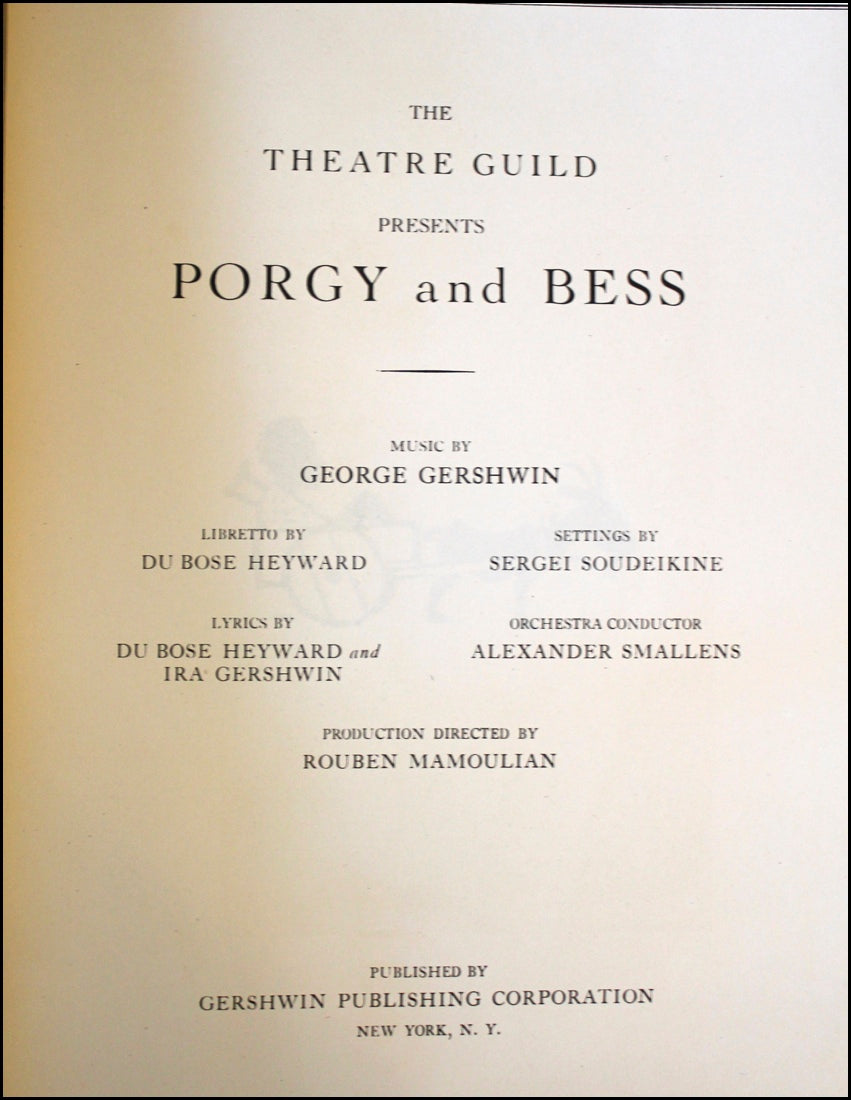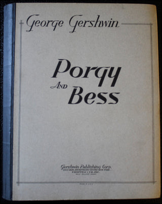 Gershwin, George. (1898–1937). Porgy and Bess. New York: Gershwin Publishing Corporation. 1935. First edition, first issue. The Theatre Guild presents Porgy and Bess. Libretto by Du Bose Heyward Lyrics by Du Bose Heyward and Ira Gershwin Settings by Sergei Soudeikine Orchestra Conductor Alexander Smallens Production Directed by Rouben Mamoulian. [Piano-vocal score]. Small folio. Original publisher's stiff printed grey wrappers with black cloth spine. 4ff. (photographic portrait; r. title, v. woodcut illustration of donkey pulling a man in a cart; r. Index of Scenes, v. Cast of Characters; r. Story of Porgy and Bess, v. dedication), 559 (music), [i] (blank) pp. Fuld p. 539. First Edition, first issue without the index of songs and without the capitalization of "Negro," in the fourth line of the story. Spine somewhat cocked, otherwise crisp and very fine copy overall of this surprisingly rare score.