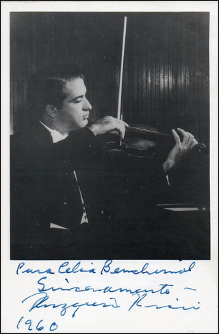 Signed vintage postcard photograph of the superb fiddler, specialist in the 19th century bravura repertory. A student of Persinger, Piastro and Kulenkampff, Ricci has been widely acclaimed for his technical prowess and was the first to record the 24 Paganini Caprices in their original version. Boldly signed and inscribed and dated 1960. 4 x 6 inches and in fine condition.