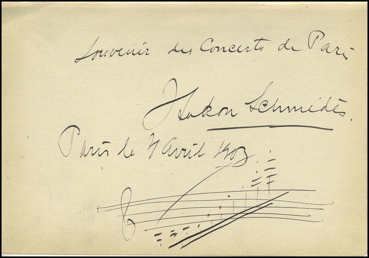 Schmedes, Hakon. (1877 - 1938). Autograph Musical Quotation. Boldly penned AMQS from the Danish violinist and composer. On an album page dated April 4, 1903 and measuring 12 x 17.5 cm.