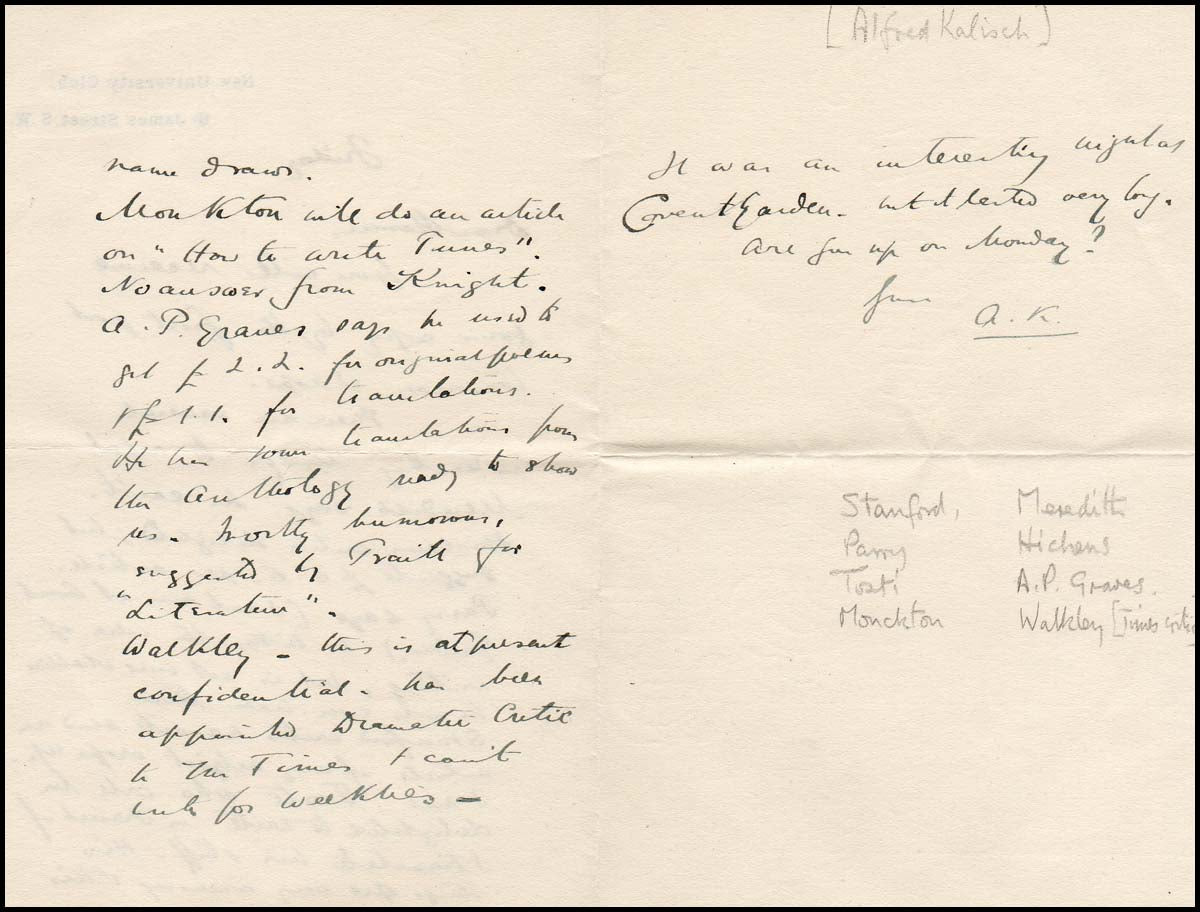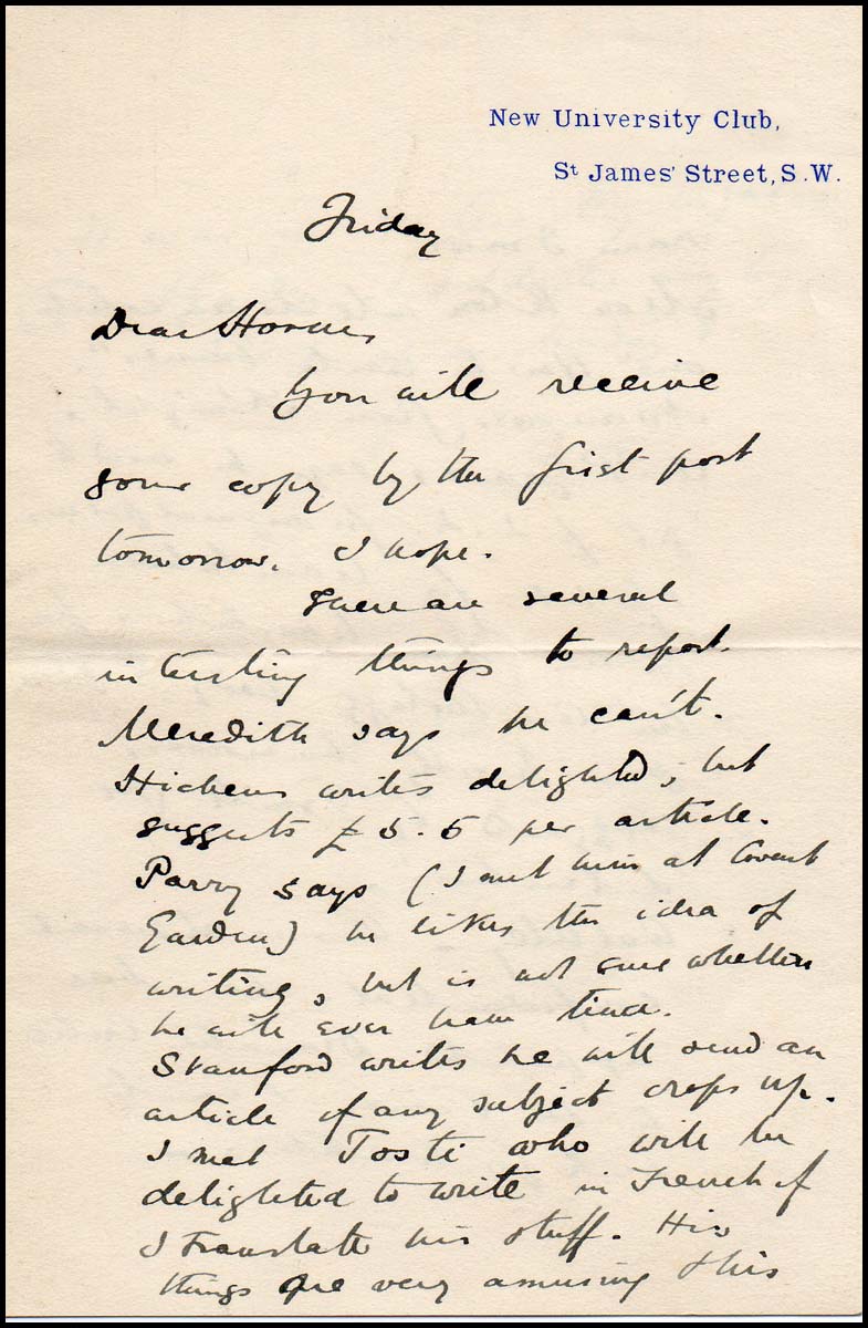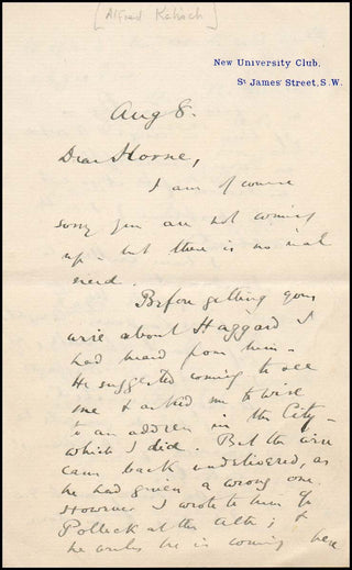 Pair of interesting autograph letters from the English music critic and librettist best remembered for his support of Strauss and for his translations of Strauss's operas. 3 pp. August 8th, ca. 1910. To Horne, regarding Elgar, Rider Haggard, Pollock, Hitchens etc.; 3 pp. [no date]. To Horne, regarding Stanford, Parry, Tosti, Monckton, Meredith, Hitchens, A.P. Graves etc. Both very fine.