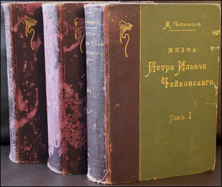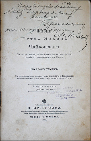 [Russian Music] Tchaikovsky, Peter Ilyich. (1840–1893) [Tchaikovsky, Modest. (1850–1916)]. The Life of Piotr Illyich Tchaikovsky - INSCRIBED by Modest Tchaikovsky to his brother's Doctor. Moscow & Leipzig: Jurgenson. 1901 - 1903. First edition. The rare complete set of three volumes published in pre-revolutionary Russia, with highly interesting and very special history and provenance, signed and gifted by the composer's younger brother Modest - a dramatist, librettist to his brother on several operas and eventually the author of this critical biography - to Tchaikovsky's physician, who was a trusted member of the Composer's household and present at the composer's death.