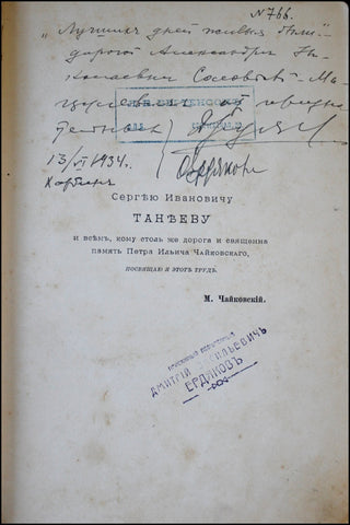 The Life of Piotr Illyich Tchaikovsky. In Russian, signed and inscribed by Modest Tchaikovsky to Doctor Lev Bertenson, Tchaikovsky's personal doctor. Complete set of 3 volumes, each approx. 22.5 cm. Original cloth binding with ornate gilt-stamped titles, with the personal stamp of Bertenson, and an additional pre-revolutionary Russian collector's POS and stamp. Bindings worn, hinges partially broken, lacking one of the portraits but otherwise complete, scattered foxing, soiling and wear, the age defects somehow rather beautiful in this case.