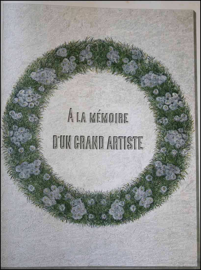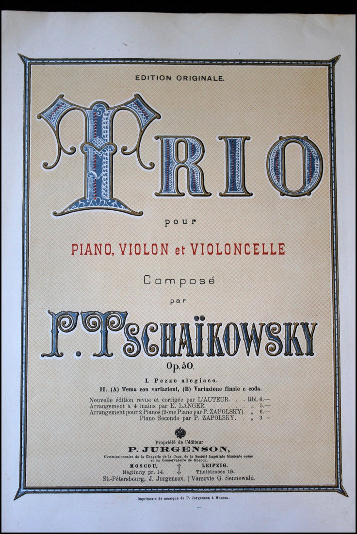 [Russian Music] Tchaikovsky, Peter Ilyich. (1840–1893). Trio pour Piano, Violon et Violoncelle, Op. 50.. Moscow: P. Jurgenson. [1882]. Edition Originale, Nouvelle édition revue et corrigée par l'auteur. Upright folio, score and parts. Piano score with decorative title page printed in gilt, blue, yellow and red, with following page illustrated with a memorial wreath and the dedication "A La Mémoire d'Un Grand Artiste." 115, 23, 23 pp. [PN] 5020. Fragile outer wrappers toned, some moderate chipping around edges and spine, otherwise fine and very clean throughout. Rare.