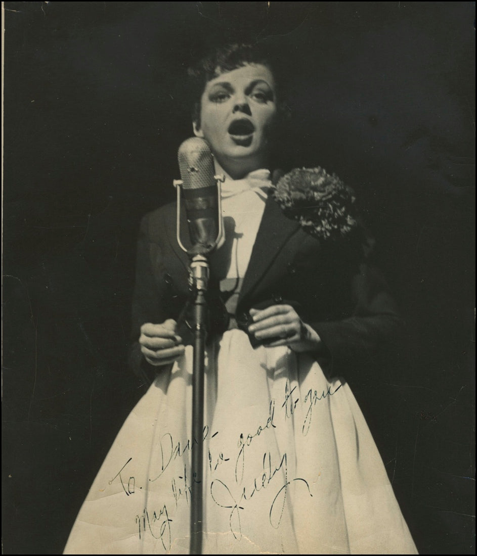 Unusual original concert photograph of the beloved singer and actress, signed and inscribed to the late singer/actor Judd Jones, who early in his Broadway career was known as Davy Jones: "To Dave - May life be good to you, Judy." 19 x 23 cm. Stamped on the verso by the photographer Zen Arthur. Some surface crazing, torn area at bottom of photograph extending just to edge of signature archivally repaired from verso and otherwise fine. Directly from Jones's estate and with a copy of the NY Times Obituary for Jones.