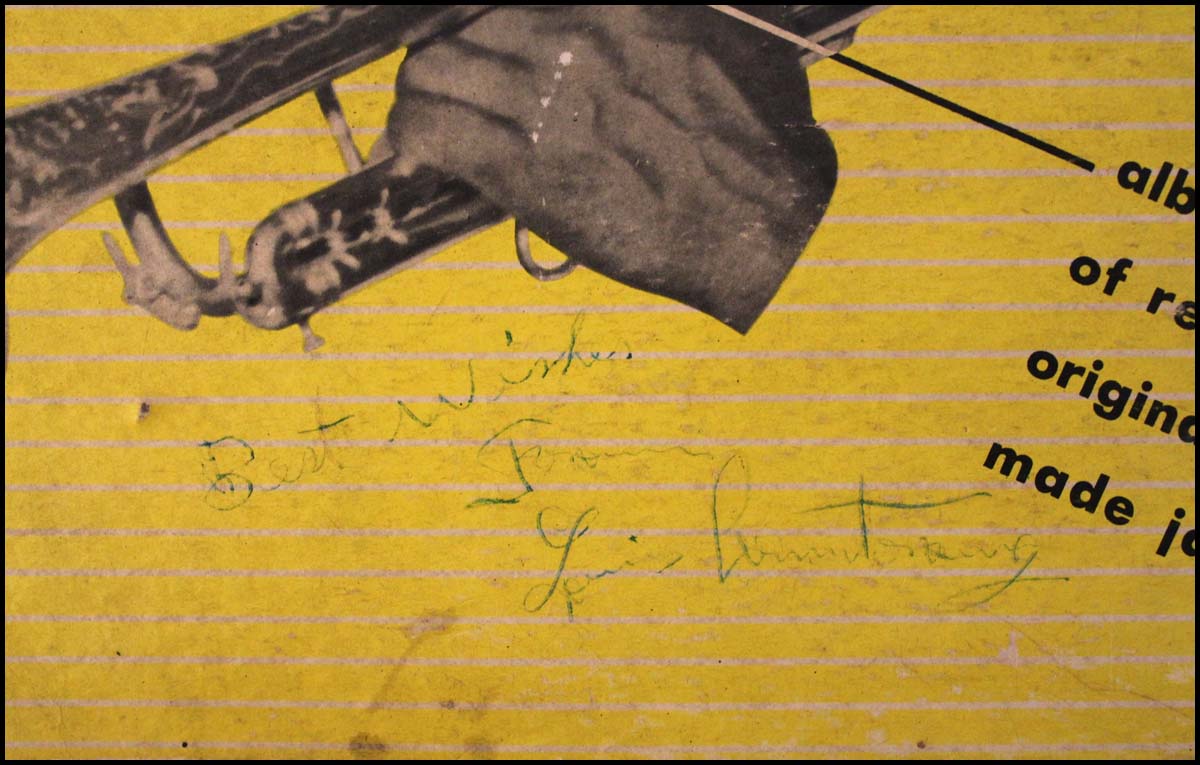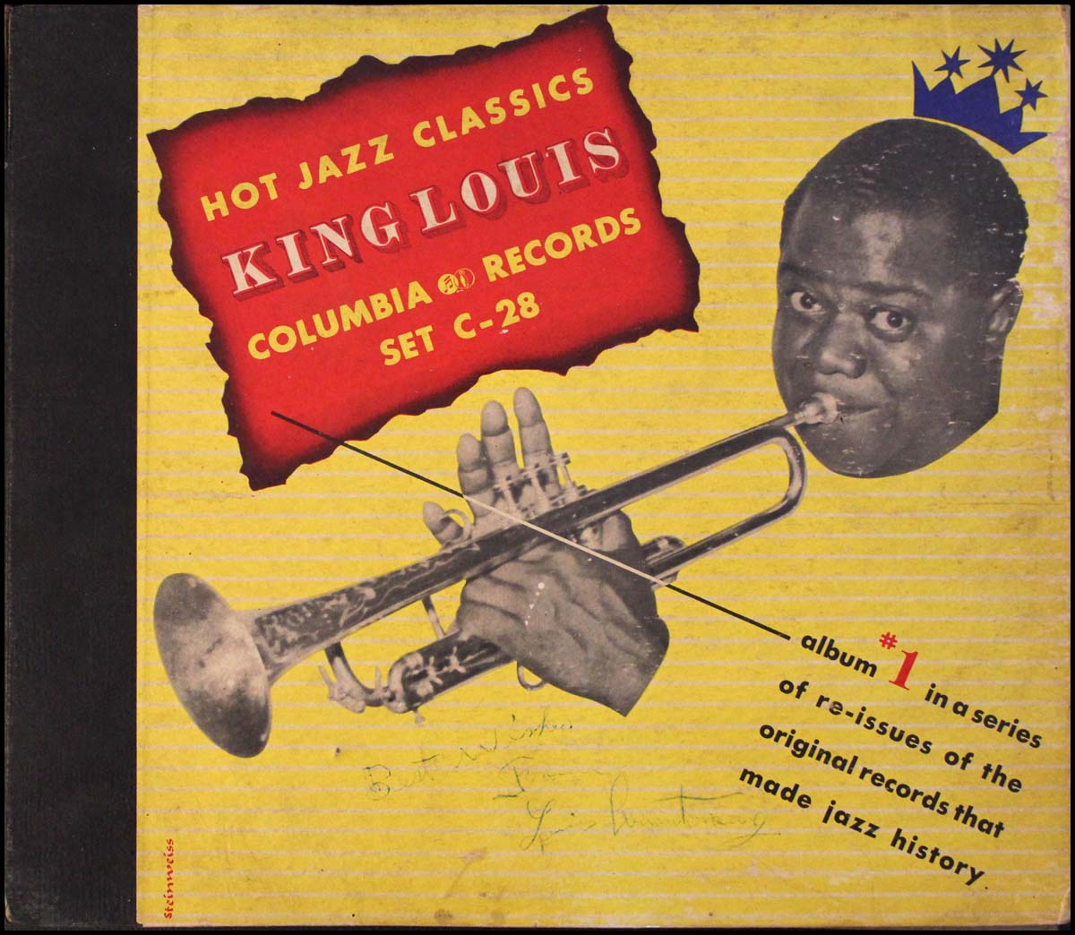 Vintage LP cover (Hot Jazz Classics King Louis Columbia Records set C-28.) with a striking image of the great Satchmo with his trumpet in hand, signed and inscribed in green ink . Edges worn, signature a couple shades light, otherwise fine. Three of the four recordings themselves are included. The striking cover design is by Alexander Steinweiss (1917 - 2011), the graphic designer credited with inventing album cover art.