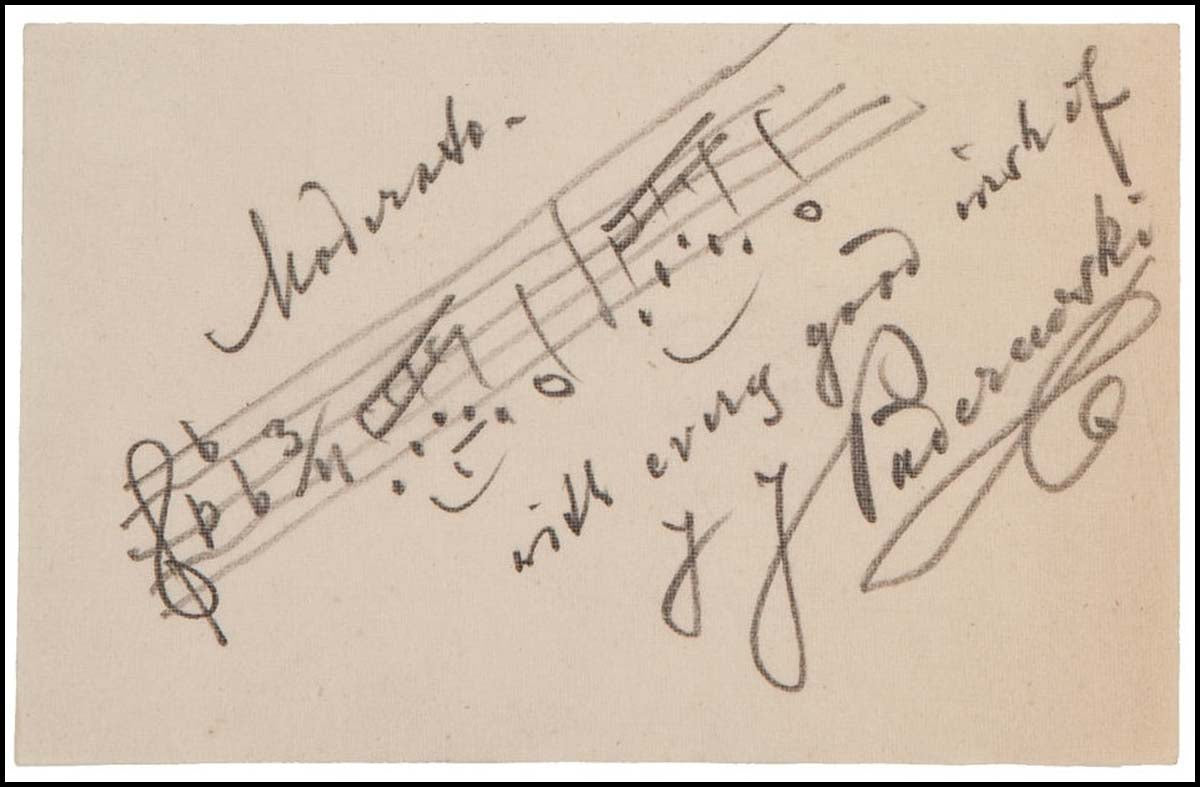 Paderewski, Ignace Jan. (1860-1941). Autograph Musical Quotation from "Manru.". AMQS from the Polish pianist, composer and statesman who was also prime minister and foreign minister of the Polish Republic (1919). 2 measures boldly written in pencil and identified as "Moderato" from the second Act of his opera "Manru." In fine condition, signed "with every good wish of I. J. Paderewski." 10.7 x 7 cm.