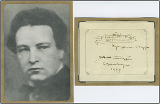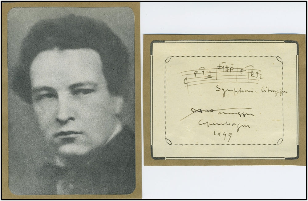 Honegger, Arthur. (1892-1955). Rare 1949 AMQS, "Symphonie Liturgique". Superb and finely penned Autograph Musical Quotation from the important Swiss-French composer, a member of Les Six. On a small autograph sheet, 7 X 9 cms. The quotation is from his "Symphonie Liturgique" (1946), a work which had an explicit programme: