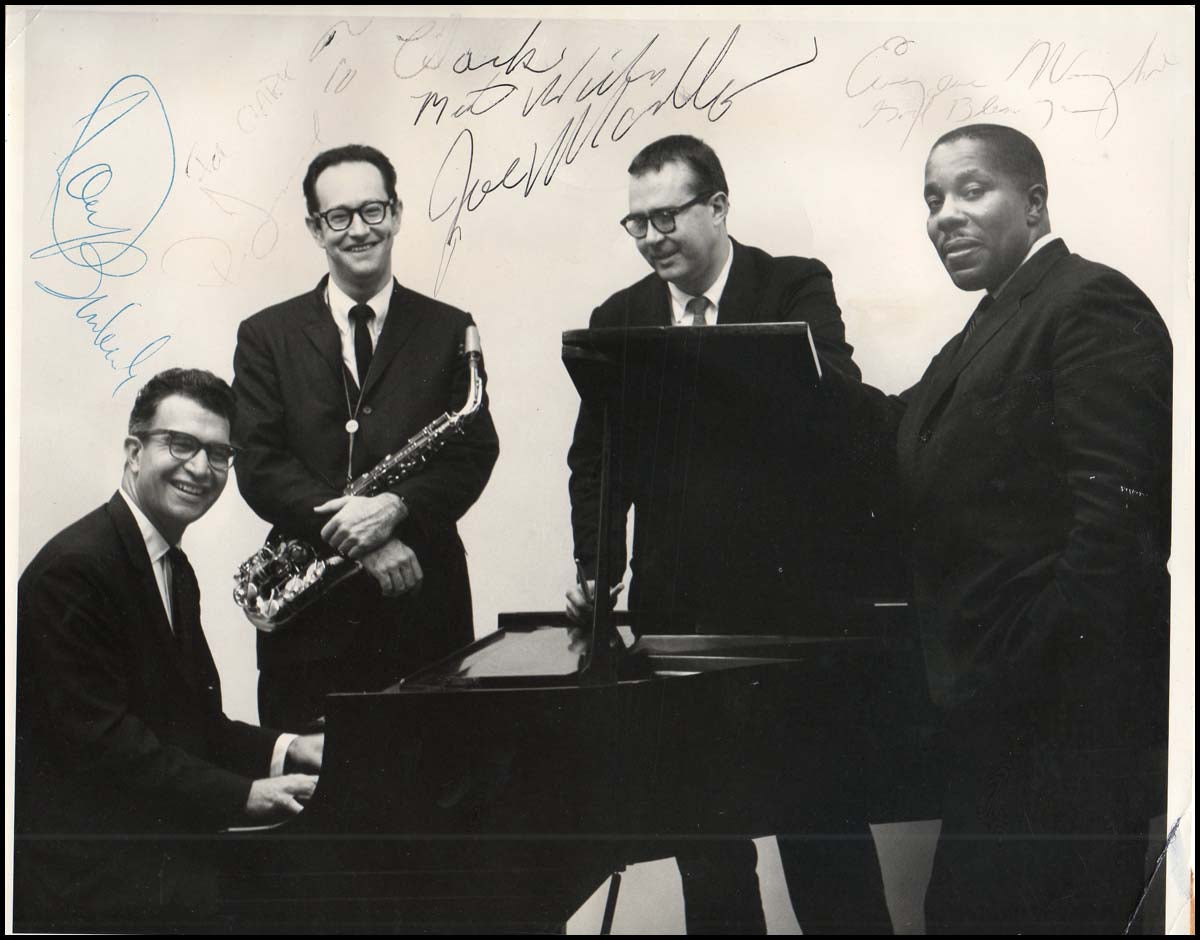 [Jazz] [Brubeck Quartet] Brubeck, Dave. (1920-2012). Signed Photograph of the The Dave Brubeck Quartet . Early signed 8 x 10 inch photograph of the "Classic Quartet" consisting of Brubeck, Paul Desmond on saxophone, Joe Morello on drums, and Eugene Wright on bass. Signed and inscribed by all four original members, corners lightly creased, mounting remnants on verso, overall fine condition.