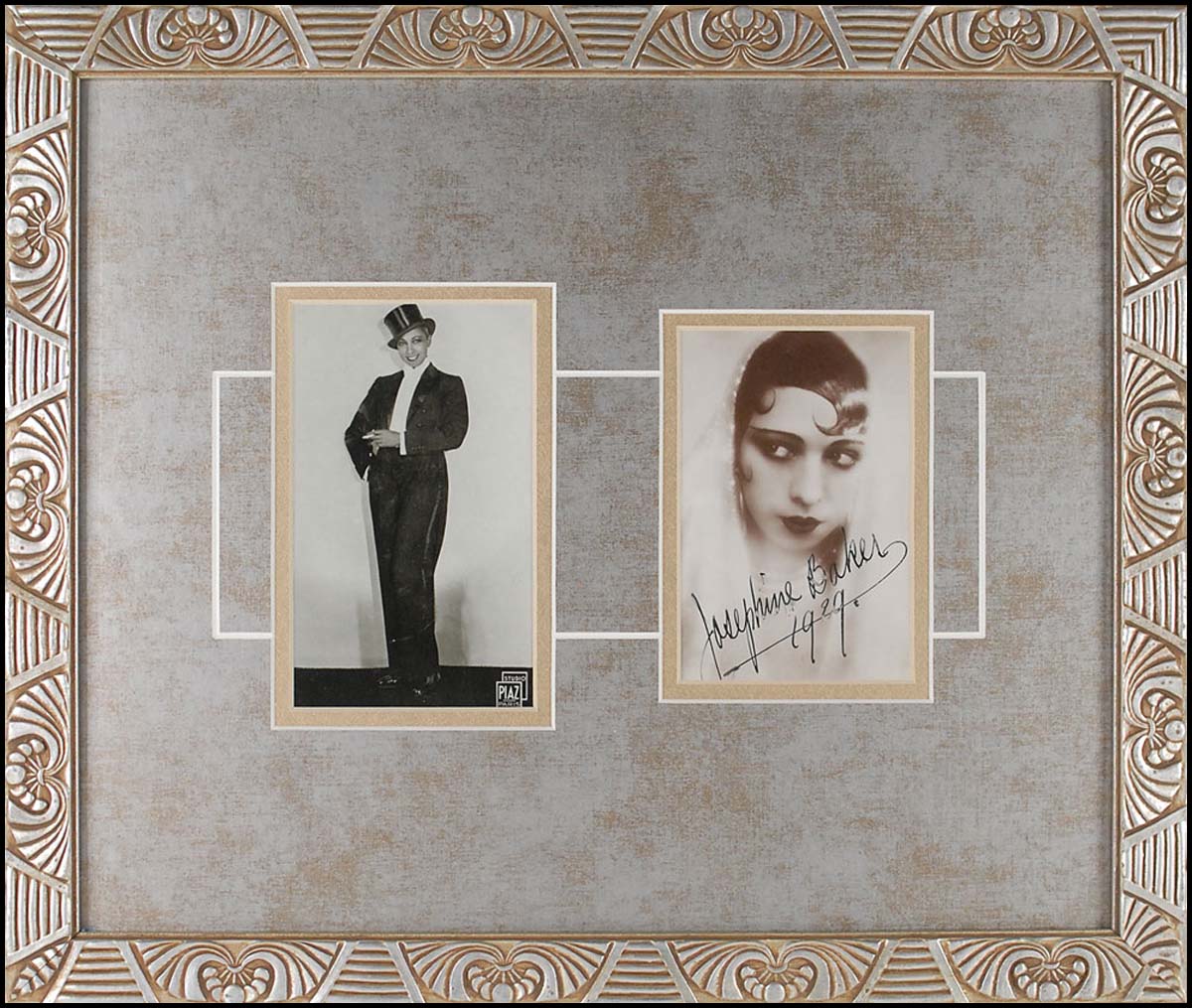 Baker, Josephine. (1906–1975). Signed Photograph - FRAMED. Signed vintage sepia postcard photograph of the legendary entertainer boldly signed in black ink and dated 1929. Attractively double-matted with another image of Baker in top hat and tails, framed under museum conservation glass in an Art Deco-motif frame.