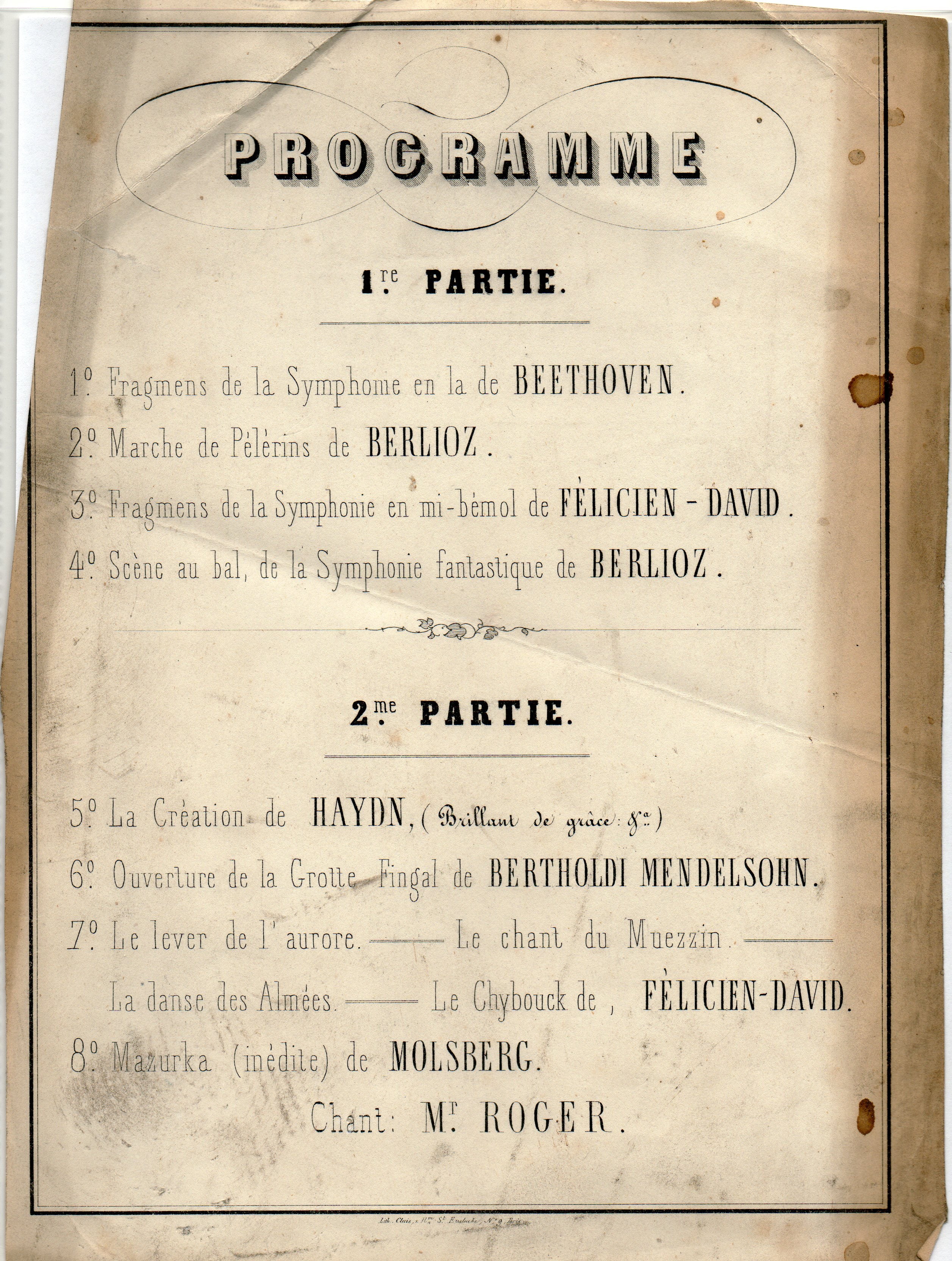 [Music in Paris] [Berlioz, Hector. (1803-1869)] [David, Félicien. (1810-1876)] [Roger, Gustave-Hippolyte. (1815–1879)]. Concert Program . Paris: Lith. Cluis...St. Eustache, No. 9. Undated concert program, ca. 1850, from an unidentified ensemble with unidentified conductor, possibly the Cercle Musical de Paris, featuring early French performances of works by Berlioz, Fèlicien David, Molsberg, Beethoven, Mendelssohn (amusingly spelled!), and Haydn and including vocal contributions by the legendary French tenor Gustave-Hippolyte Roger. 8 x 10 inches, toning and staining around edges, upper left corner perished, creased.