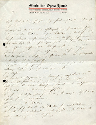 [Strauss, Richard. (1864–1949)] Hammerstein, Oscar (I). (1847-1919). Autograph Letter Signed about the first American Presentations of Strauss's operas Salome and Elektra. An important autograph letter with candid revelations about the business practices of the legendary German-born businessman and theater impresario to the German impresario Norbert Salter. In German. [New York,] October 29, [1908]. 3 pp. on recto pages of three sheets of Manhattan Opera House stationery. All three leaves punched for binding, else fine. Translated in full: