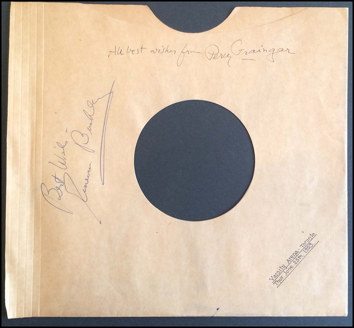 Signed paper LP Album sleeve from the Australian-born pianist, conductor, and composer best known for his folk settings and colorfully experimental works. Boldly signed signed and dated Toronto, 1953 and signed additionally by conductor Emerson Buckley. In fine condition.