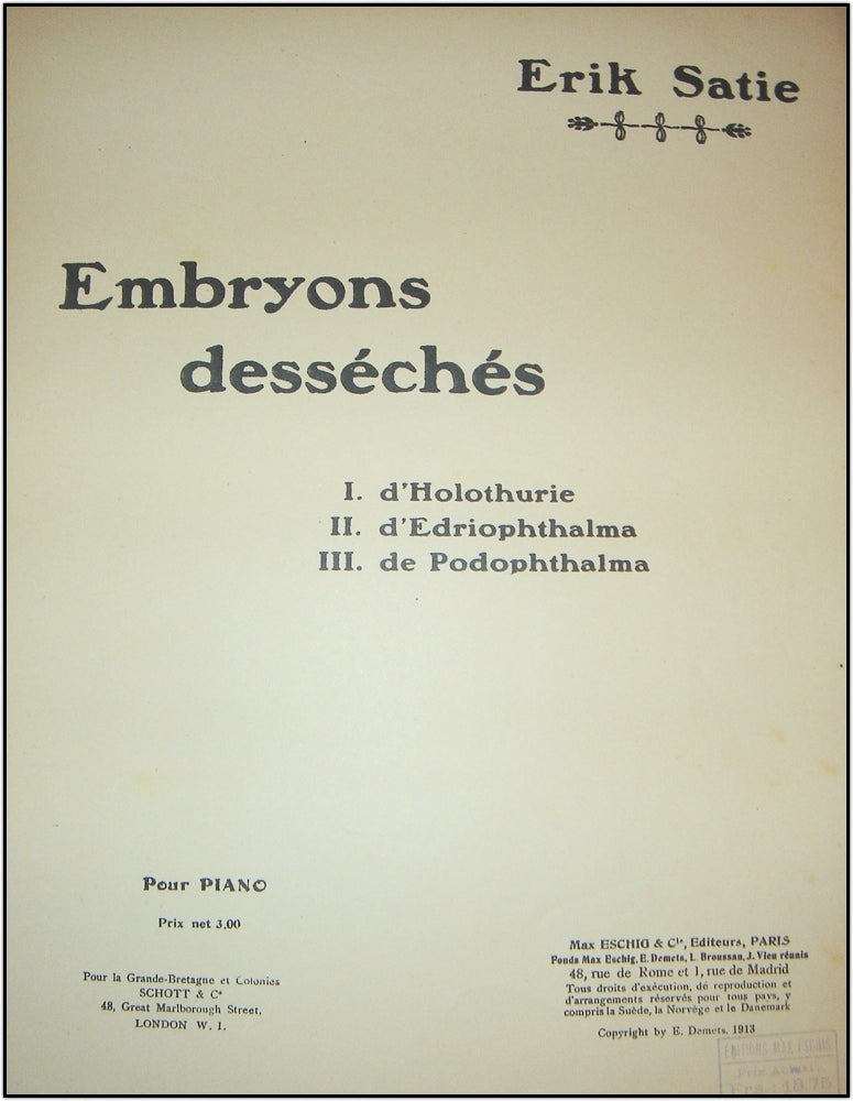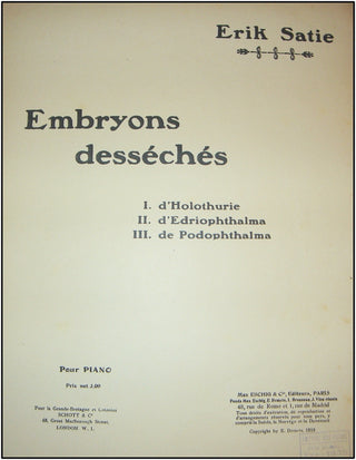 Satie, Erik. (1866-1925). Embryons desséchés: pour piano . Paris: Eschig; E. Demets. 1913. First Eschig Edition.