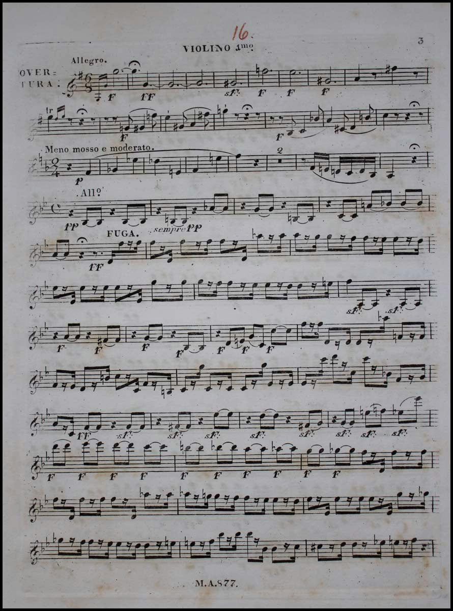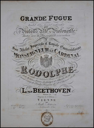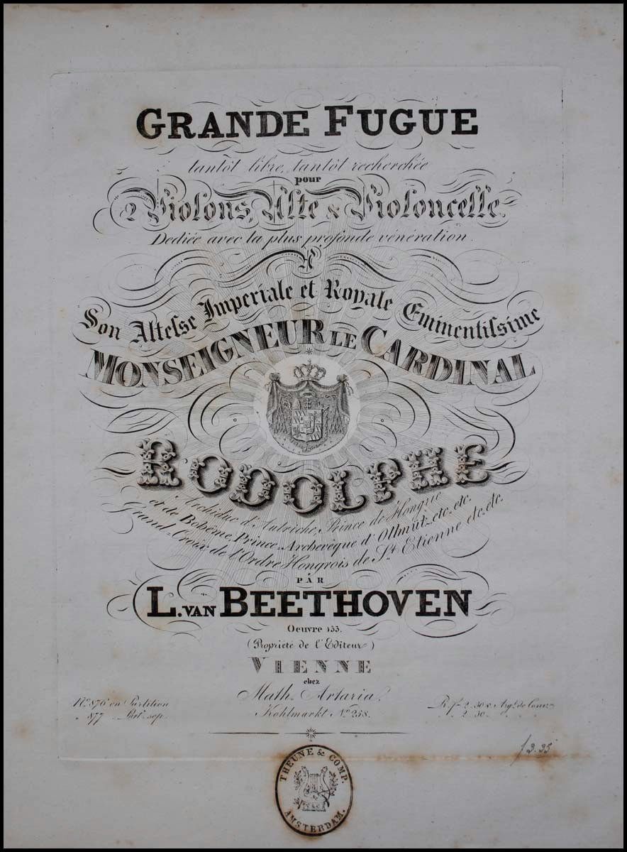 Beethoven, Ludwig van. (1770–1827). Grande Fugue tantôt libre, tantôt recherchée pour 2 violons, alte & violoncelle....Oeuvre 133.. Vienne: Chez Artaria. [1827]. First edition. Parts. Folio (32 x 25.5cms). Violin I: 10 p. Violin II, viola & cello: 9 p. each. Engraved throughout. [PN] 877. In fine condition, with a small red pencil "16" to the head of each part. Rare first edition of one of the central masterworks of Western Music. Hoboken 524; Kinsky p.405.