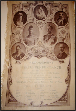 [Opera] Melba, Reszke, Plancon etc. . Silk Covent Garden Opera Program, 1893. . Unusual gala program printed on silk, from a State Performance of Gounod's "Romeo and Juliet" at the Royal Opera Covent Garden. "By Command of Her Most Gracious Majesty The Queen in Honour of the Marriage of The Duke of York [future George V] and the Princess May [Mary] of Teck." The date of the performance is given as July 4, 1893. The truly incredible cast included both Jean and Edouard de Reszke, Nellie Melba and Pol Plancon!