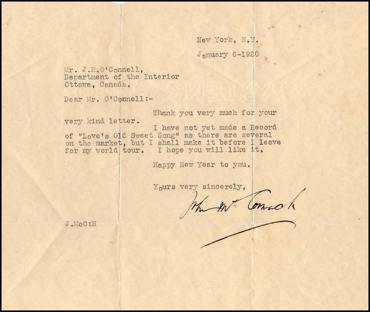 McCormack, John. (1884-1945). Signed Letter about recording "Love's Old Sweet Song.". Typed letter from the great Irish tenor, boldly signed "John McCormack." Stating that he has "not yet made a Record of 'Love's Old Sweet Song' as there are several on the market, but I shall make it before I leave for my world tour. I hope you will like it. Happy New Year to you." Sold together with a vintage 8 x 10 inch RCA Victor promotional photograph.