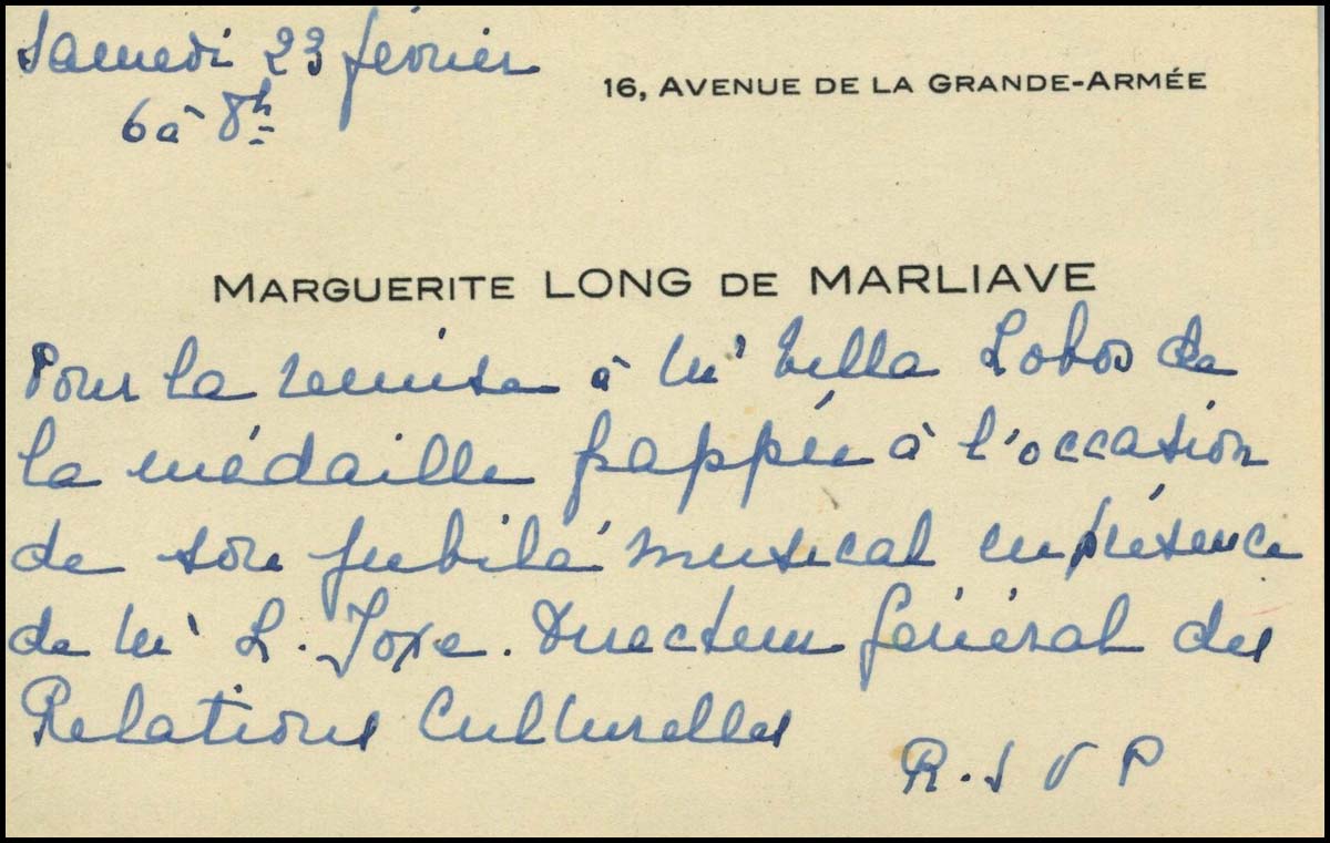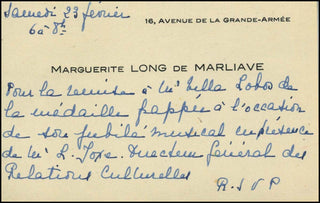 Villa-Lobos, Hector. (1887 - 1959) [Schuster, Joseph. (1905-1969)]. Signed Photograph to Mme. Schuster. Striking signed photograph of the Brazilian composer, inscribed to the wife of the important cellist, Joseph Schuster and from his collection. In fine condition.