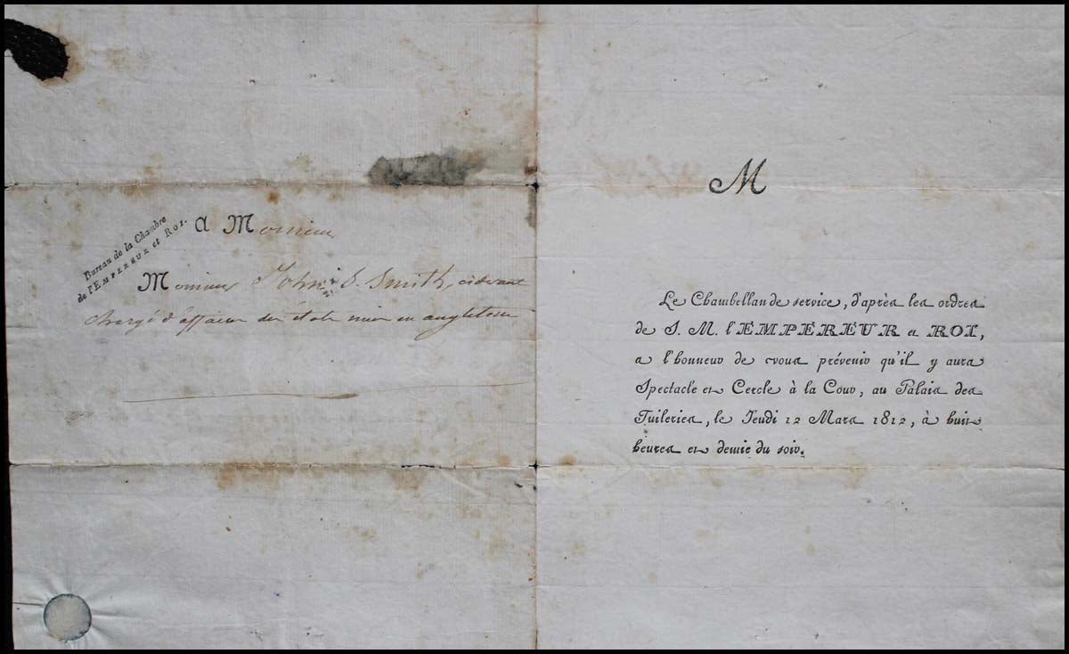 Printed invitation dated 12 March, 1812. Sent in the name of Emperor Napoleon, for an evening party to be held at the Palace des Tuileries. Addressed in ink in an unknown hand to John Spencer Smith, "Chargé d'affaires des états unis en angleterre." The address side creased and foxed, with small torn area at upper left corner. 21.5 x 34.5 cm.
