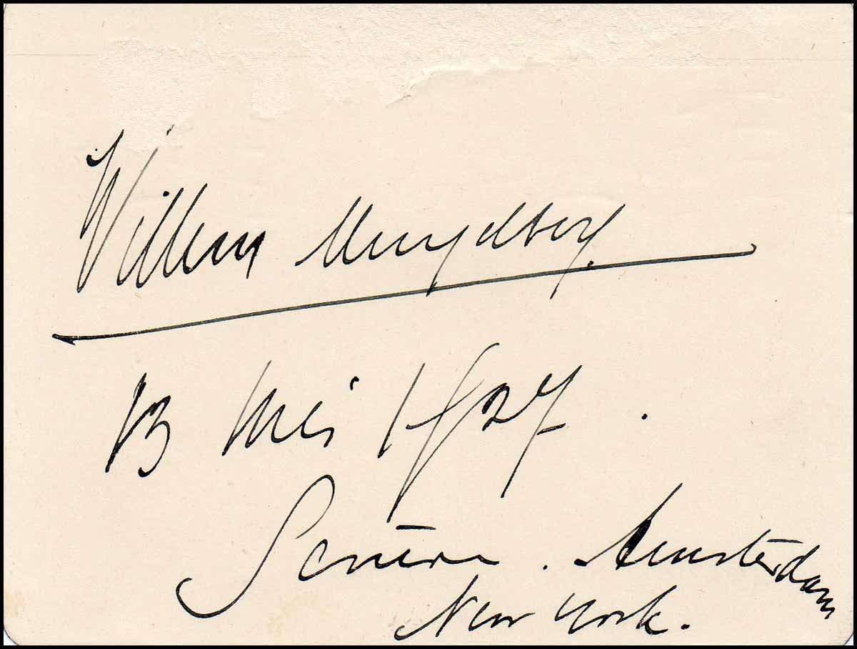 Autograph signature of the important conductor, friend and advocate of Mahler, Strauss, Schoenberg and Reger. Dark fountain pen ink signature ('Willem Mengelberg') and date, 13th May 1927, in his hand on a white card. Some slight scuffing at the head of the card, only very slightly affecting one letter of the signature.