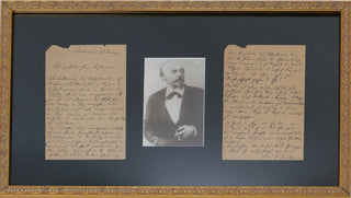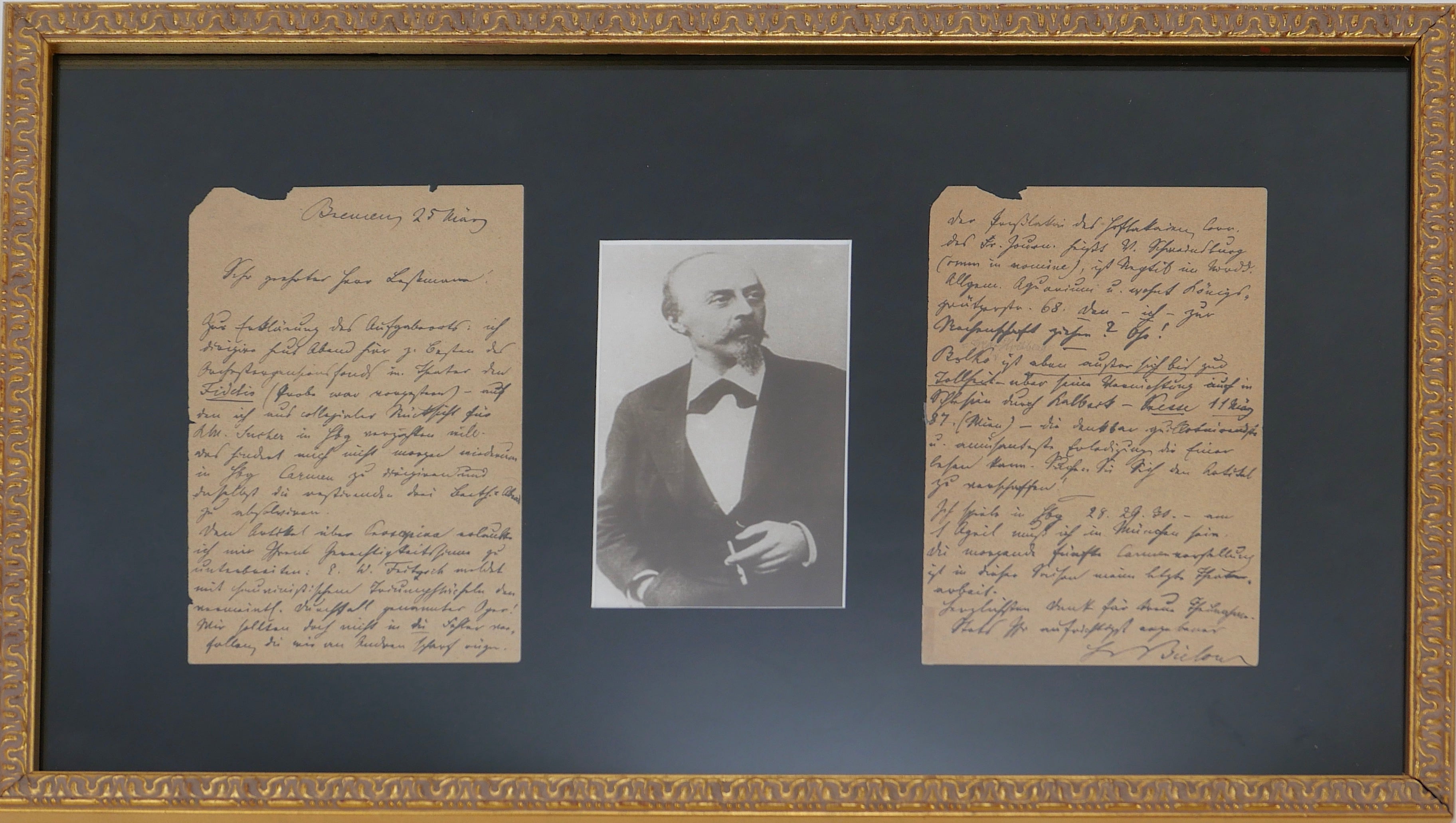 ALS of the legendary German conductor, pianist and composer to Otto Lessmann. In German. Dated Bremen, March 25 [n.d.]. 2 pp. Bülow updates his correspondent on his performing activity and writes (not without gossip and sneer) about the about the reception of some recent works and composers. In part, translated (full translation below): "I take license to submit the article on Proserpine [by Saint-Saëns] to your sense of judgment: Ernst Wilhelm Fritzsch reports with chauvinistic triumphant gesture the alleged failure of that opera! After all, we should not succumb to making those mistakes that we severely criticize in others... Bolko is outraged to insanity by his destruction even in Silesia by the Kalbeck Press of March 11, [18]87 (Vienna) – the most killing [literally, 'guillotinating'] and amusing dismissal imaginable that one can read. Try to find the article." Octavo; handsomely matted in black velvet and set into a carved gilt frame. A beautiful presentation, ideal for display.