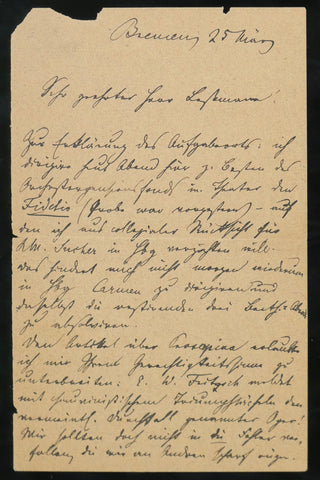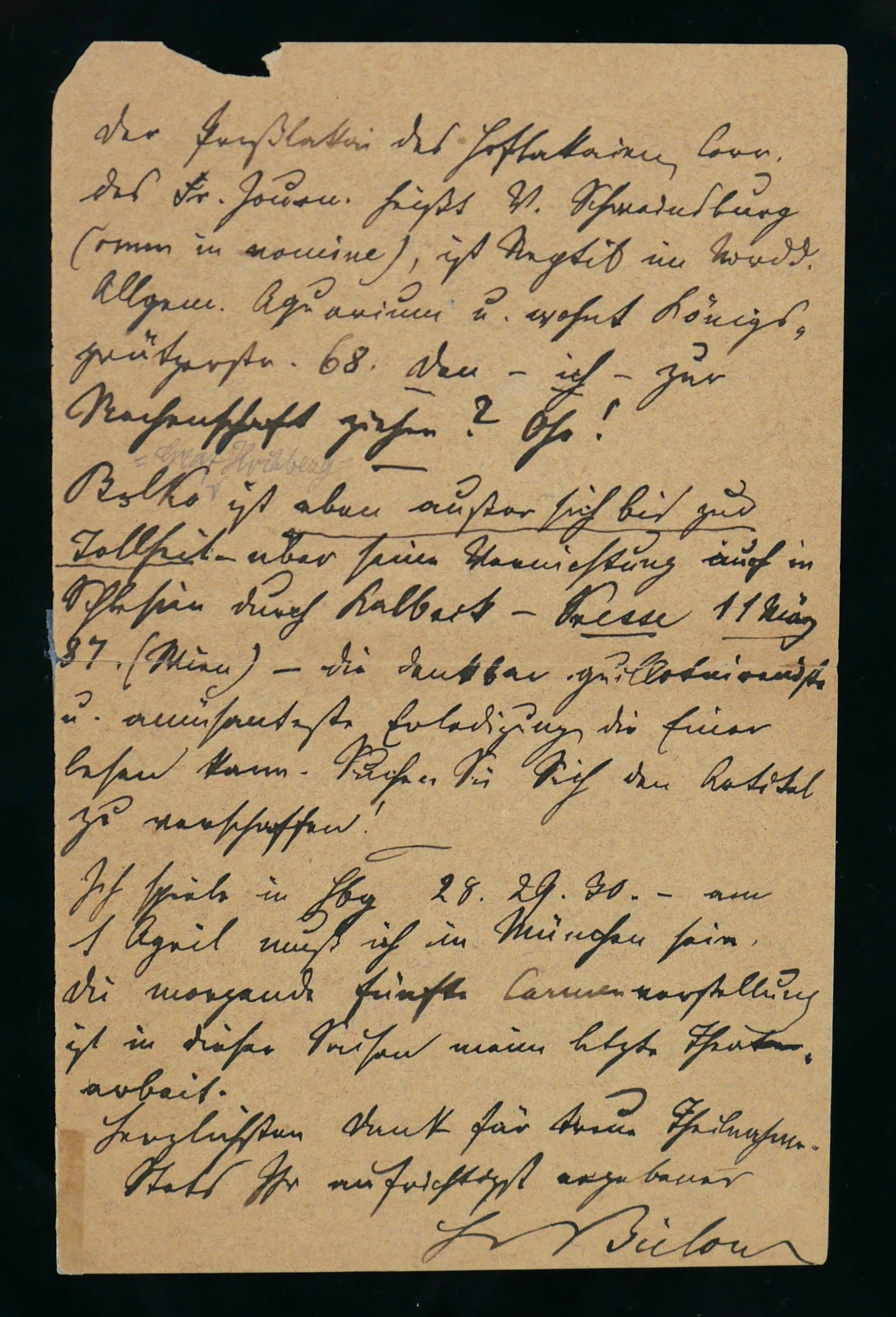 The content allows to date the letter to 1887. Otto Lessmann (or Leßmann, 1844–1918), a critic and composer in Berlin, had once studied with Bülow. Bolko von Hochberg (1843–1926), a count in Silesia, was active as a composer and theater director. E.W. Fritzsch was a publisher of music and literature in Leipzig; his periodical was Musikalisches Wochenblatt. Max Kalbeck (1850–1921), a critic based in Vienna, is now best remembered for his monumental monograph on Brahms.