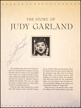 Judy Garland concert tour program, 9 x 12 inches, featuring images and a biography of Garland’s career, neatly signed in blue fountain pen by Garland next to an image of her singing under the heading "The Story of Judy Garland." In fine condition, with some mild handling wear. Obtained in person at Garland's 1961 performance at the Atlantic City Convention Hall Ballroom.