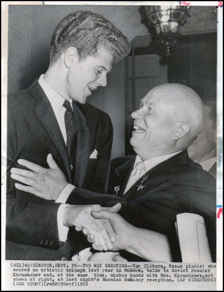Vintage 8 x 10 inch wire photograph of the American pianist who won worldwide recognition in 1958 after winning the first International Tchaikovsky Piano Competition in Moscow, at the height of the Cold War. He is shown with Soviet Premier, Nikita Krushchev. Diagonal crease, some marks from newspaper reproduction, otherwise good.