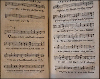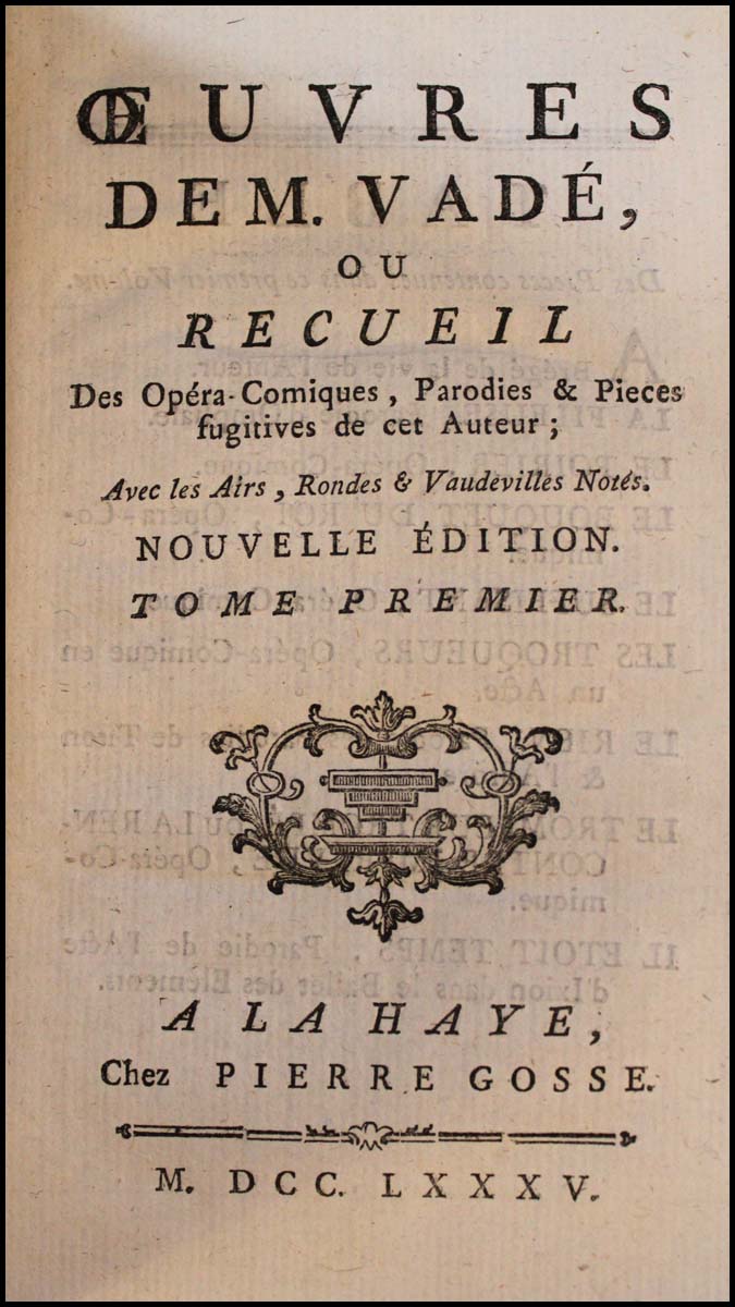 Vadé, Jean Joseph. (1719-1757). Oeuvres de M.Vadé ou Recueil des Opéras Comiques, Parodies et Pièces fugitives de cet Auteur Avec les Airs, Rondes & Vaudevilles Noté. La Haye: Chez Pierre Gosse. 1785. 2 volumes in-12° (10 x 17 cm). 323 & 299 pp. Full leather, ornate gilt stamping on spines. Small chip to head of spine of Volume 1, else fine throughout. Each volume containing approx. 50 pp of printed music.