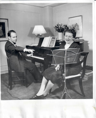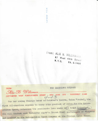Traubel, Helen. (1899–1972) & Leinsdorf, Erich. (1912–1993). Original "Tristan" Rehearsal Photograph. Original 1943 Alex Williamson photograph of the soprano and conductor rehearsing in a practice studio, in preparation for Traubel's Chicago debut as "Isolde" with the Metropolitan Opera Company at the Chicago Opera House. 8 x 10 inches (20.5 x 25 cm.). Edges a little worn, some light rippling to the image, otherwise fine.