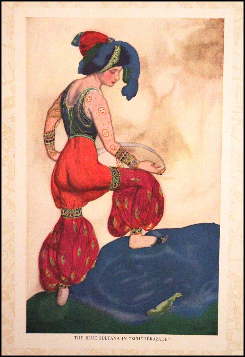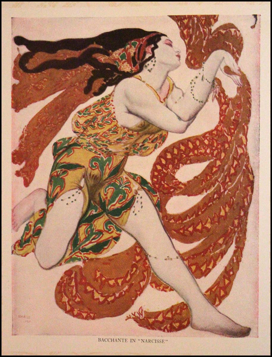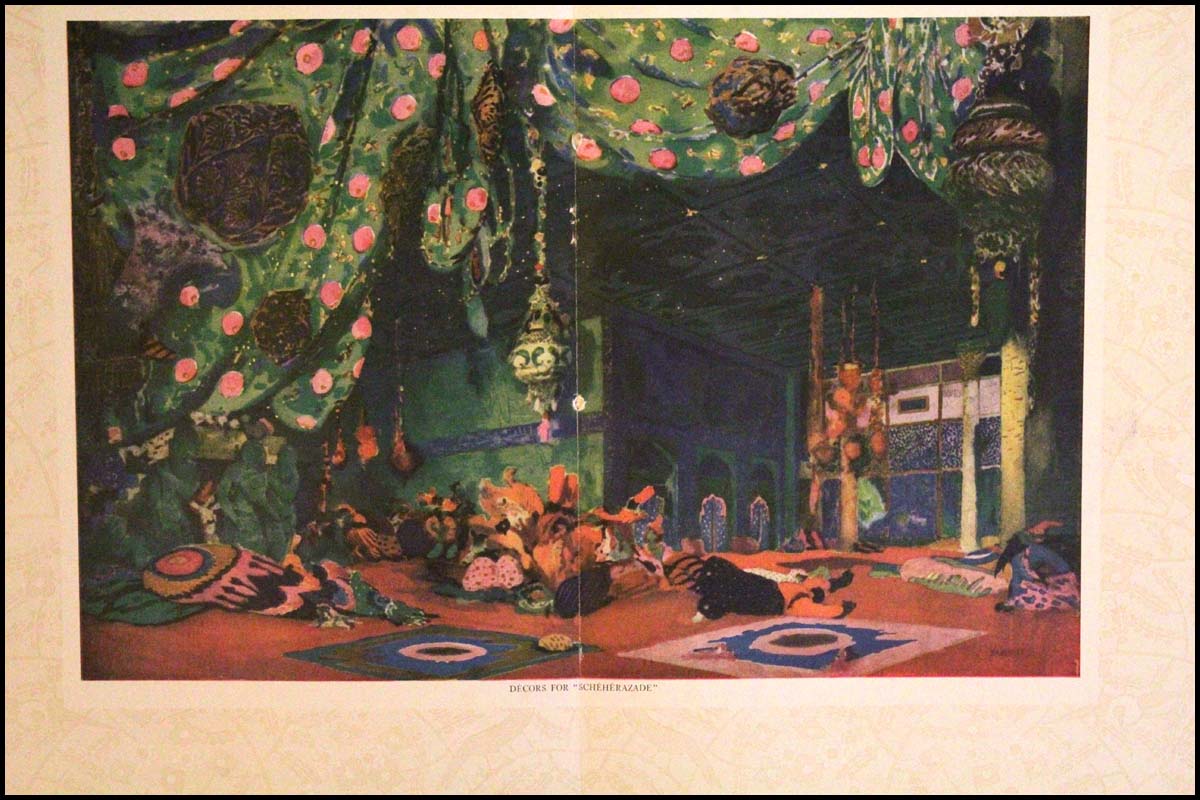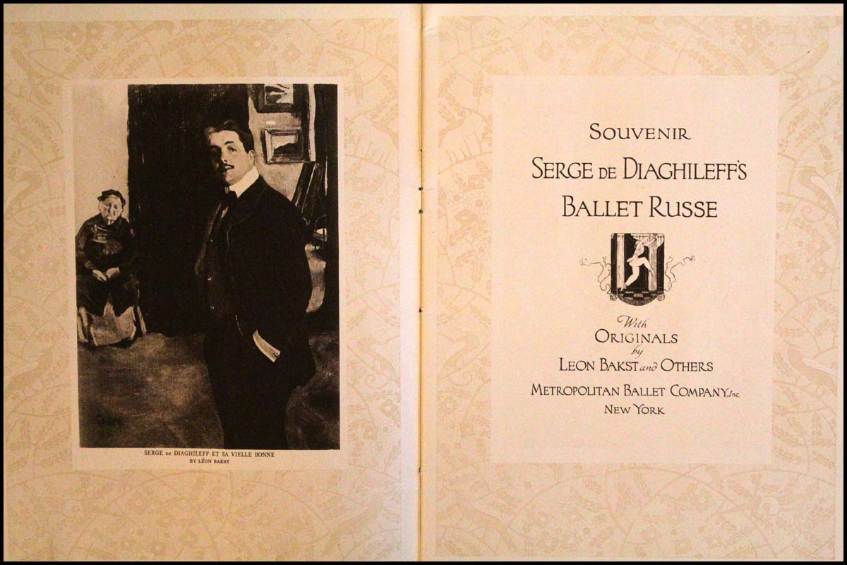 Sumptuous souvenir program published by the Metropolitan Ballet Company for the first American tour of the Ballets Russes. 9 x 12 inches. 36 pages, including many full-color illustrations of costumes and scenery by Leon Bakst and others as well as introductions to a number of ballets including: 'Le Pavillon D'Armide'; 'L'Oiseau De Feu'; 'Les Sylphides and Papillons'; 'Le Spectre de la Rose'; 'Narcisse'; 'Schéhérazade'; 'Sadko'; 'Thamar'; 'Le Carnaval of Schumann'; 'Prince Igor'; 'Petrouchka'; 'Snégourotchka'; 'Daphne et Chloe'; 'L'Après-Midi d'un Faune'; 'Le Dieu Bleu'; and 'Cléopâtre'. Printed on heavy ivory uncoated paper, the cover of thick mottled grey paper, with embossed lettering and a figure of a seated Buddha. Program is complete and in very fine condition.