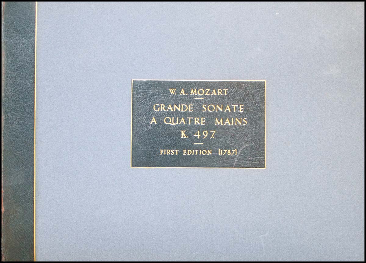 Mozart, Wolfgang Amadeus. (1756–1791). Grande Sonate a quatre mains sur un Clavecin ou Pianoforte. [K. 497]. Vienne: Artaria. [1787]. First edition, first issue. Oblong 4to, 225 x 301 mm. 39 pages. Engraved throughout. [PN] 108. With handwritten opus number on title. Modern 1/4 morocco with morocco lettering piece. Occasional light soiling, margins trimmed slightly entering music on several leaves, small horizontal strip torn from lower outer corner of title affecting music on verso, but expertly repaired with a facsimile strip on both sides. Early signature on title. Köchel 497; Haberkamp, page 266.