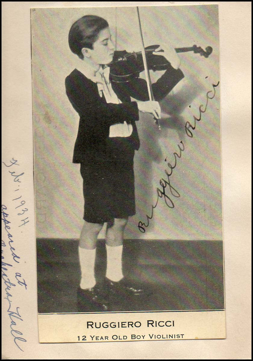 Ricci, Ruggiero. (1918–2012). Signed Photograph at age 12. Rare original signed halftone photograph of the superb prodigy fiddler at age 12! He went on to become a specialist in the 19th century bravura repertory. A student of Persinger, Piastro and Kulenkampff, Ricci has been widely acclaimed for his technical prowess and was the first to record the 24 Paganini Caprices in their original version.