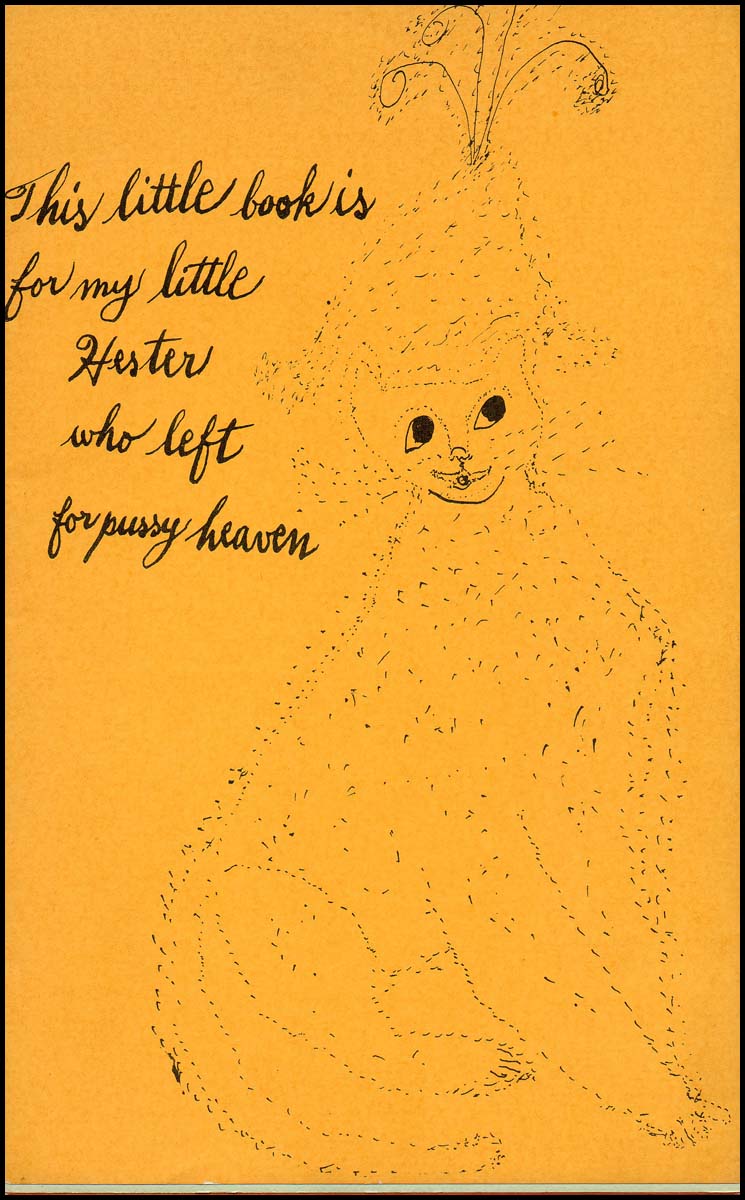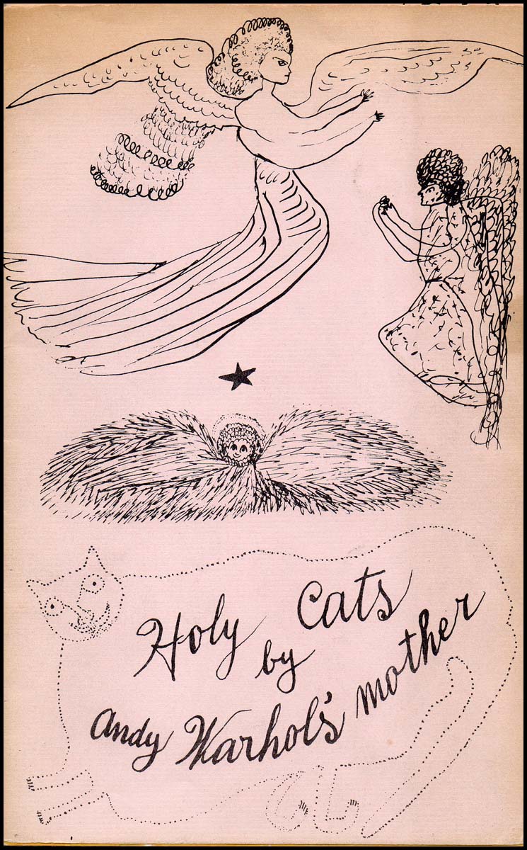 "Julia (Andy's mother) moved to New York City in 1952 to be with Andy. She continued her singing and drawing through the Fifties and Sixties. Andy admired her abilities and used her penmanship often. Her decorative handwriting would often accompany his illustrations. She won awards for her lettering...In 1957 she illustrated a small book called Holy Cats. It featured what she loved to draw most, angels and cats." (Warhola.com)