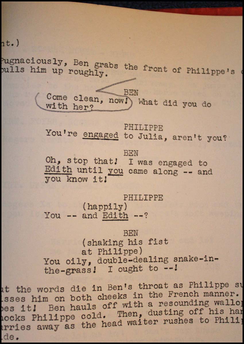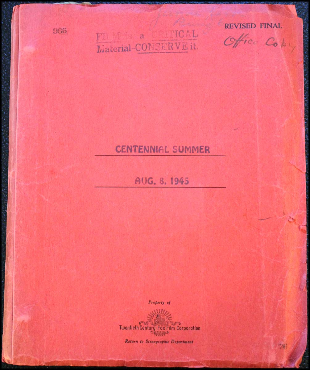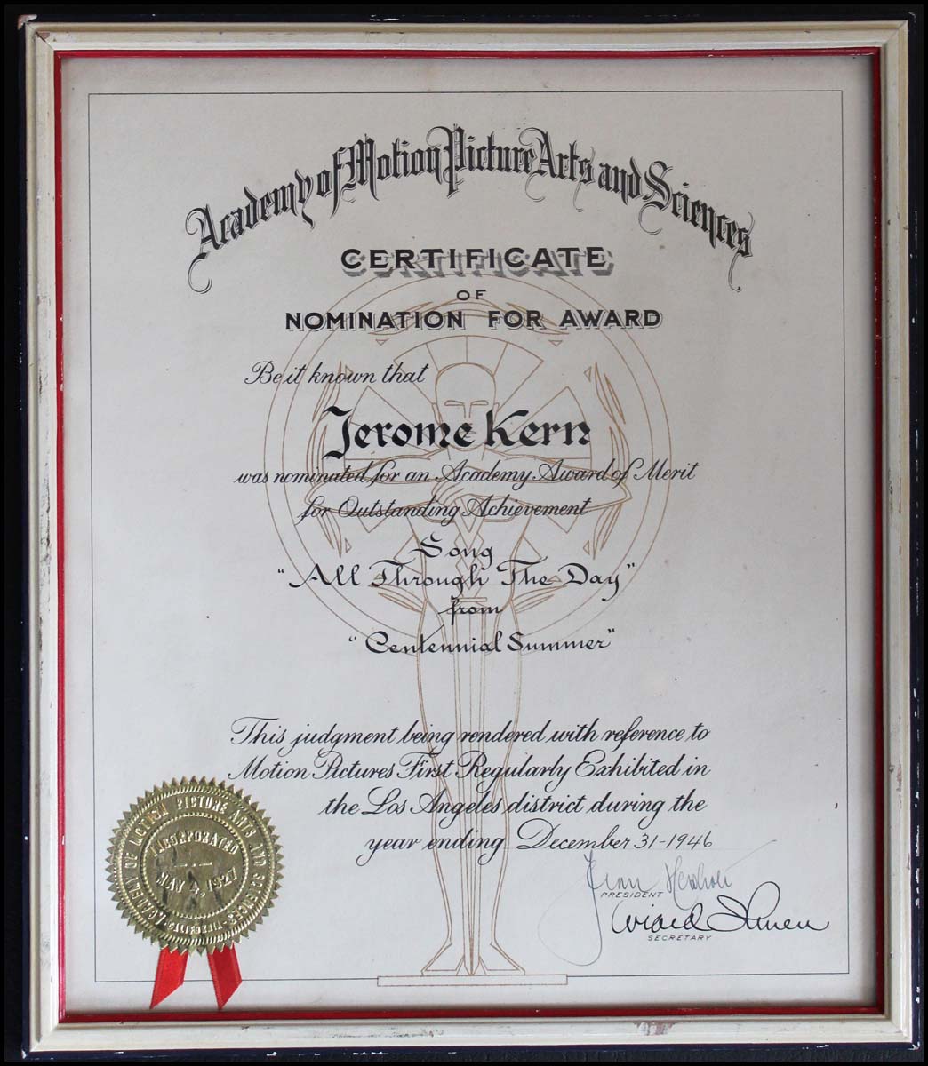 Kern, Jerome. (1885–1945) . "Centennial Summer" - Kern's annoted script and Academy Award Nomination. The revised frinal script of "Centennial Summer," August 8, 1945. 122 pp. With underlining and emphasis (arrows, circles etc.) notations in Kern's hand on 6 pages in pencil and "Office Copy" written in his hand ink on the front cover. Accompanying it is the Academy Award nomination for "All Through the Day" for best song of 1946, and an original 11 x 14 inch doubleweight photograph of Kern. All these from the collection of Jerome Kern, by descent to his daughter Betty Kern Miller and then to the previous owner, and never previously offered on the market.