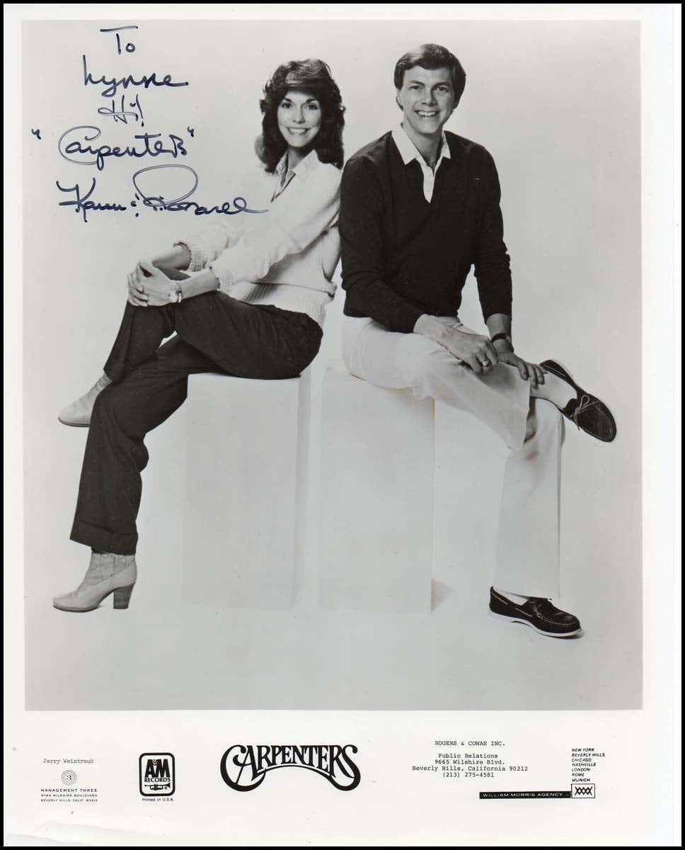 [Carpenters] Carpenter, Karen. (1950 - 1983) & Carpenter, Richard. (b. 1946). Signed Photograph. Rare signed 8 x 10 inch glossy photograph of the beloved American vocal and instrumental duo, consisting of sister Karen and brother Richard Carpenter. The Carpenters were the #1 selling American music act of the 1970s. During a period in the 1970s when louder and wilder rock was in great demand, Richard and Karen produced a distinctively soft musical style that made them among the best-selling music artists of all time. Karen was a drummer of exceptional skill, but she is best remembered for her vocal performances of idealistic romantic ballads of true love. The Carpenters signature song is "We've Only Just Begun" which remains a popular wedding ballad. Karen suffered from anorexia nervosa, an eating disorder of extreme weight loss dieting, a little-known illness at the time, and although she had begun recovery, she died at the age of 32.