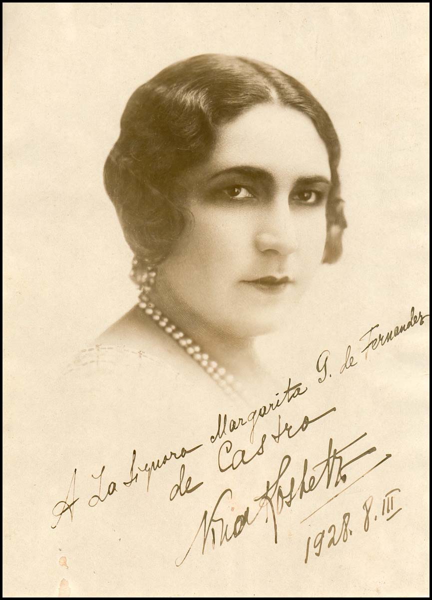 Koshetz, Nina. (1891 - 1965). Signed Photograph. Signed doubleweight sepia photograph of the great Ukrainian soprano. Signed and inscribed in Havana in 1928 and in fine condition. 7 x 9.75 inches. Uncommon.