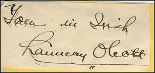 Autograph signature "Yours in Irish / Chauncey Olcott" from the popular American stage actor, singer and songwriter, whose most famous songs include "My Wild Irish Rose" and "When Irish Eyes are Smiling." 4.25” x 1.9” vintage trimmed album page.