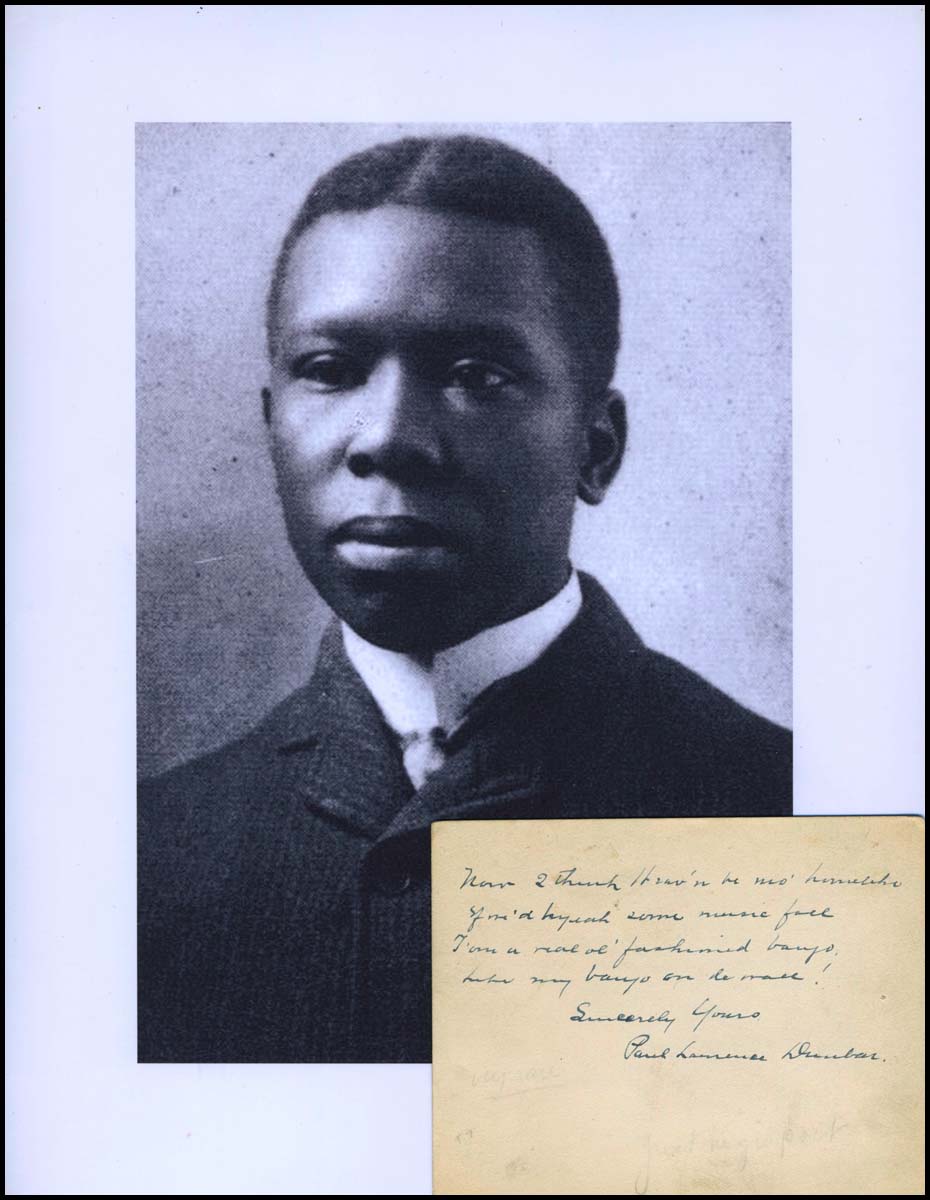 [Literature] Dunbar, Paul Laurence. (1872 - 1906). "A Banjo Song" - Autograph Signed Poem. Autograph manuscript signed, on a 4.5 x 3.5 inch card, four lines of poetry from his poem "A Banjo Song" which was printed in Lyrics of Lowly Life. In full: "Now I think Heav'n be mo' homelike / If we'd hyeah some music fall / F'om a real ol' fashioned banjo, Like my banjo on de wall! Sincerely Yours, Paul Laurence Dunbar." Very fine condition.