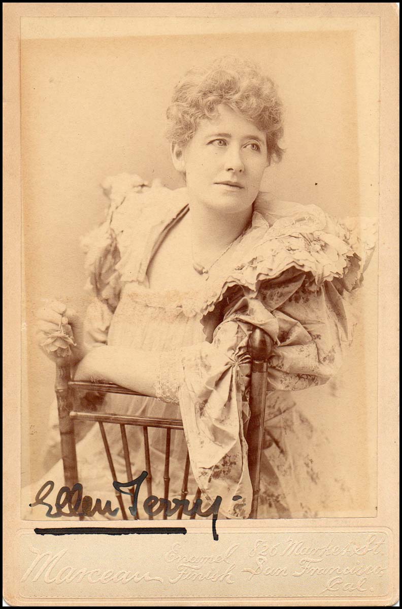 [Film & Theatre] Terry, Ellen. (1847-1928). Signed Cabinet Photograph. Signed Marceau of San Francisco cabinet photograph of the great actress, boldly signed with her name alone. In fine condition, with a block of uniform toning and mounting traces on verso. 11 x 16.5 cm.