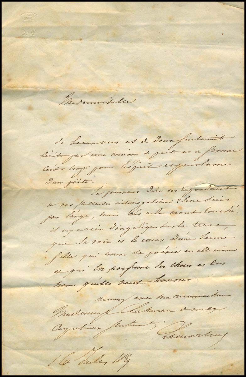 [Literature] Lamartine, Alphonse de. (1790 - 1869). Autograph Letter. ALS, signed "Lamartine." 16 July, 1839. Addressed to Mademoiselle [Chuhrsac]. Translated in part: "The beautiful verse and the sweet sentiments written by the hand of a poet and woman are too much for the spirit and the soul of a poet. I would say by way of response to your flattering questions, that I am not an angel, but that I have been touched by angels! There is nothing angelic on this earth, but for the voice and heart of a -- girl who finds poetry in herself and perfumes with it the things and men who she wishes to honor." Partial separation along one of several folds, light staining, else fine.
