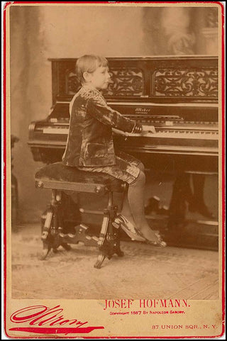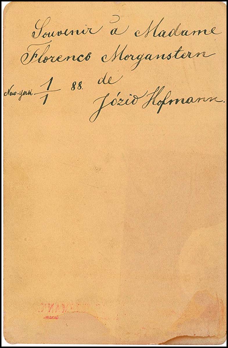 Original Sarony of NY cabinet photograph of a young Hofmann seated at a piano, signed and inscribed in fountain pen on the reverse, as a 12 year old, “Souvenir a Madame Florence Morganstern de Jozio Hofmann, New York 1-1 88.” Scattered minor marks to image and some scattered soiling and modest dampstaining to reverse, otherwise fine condition. Very scarce, this early!