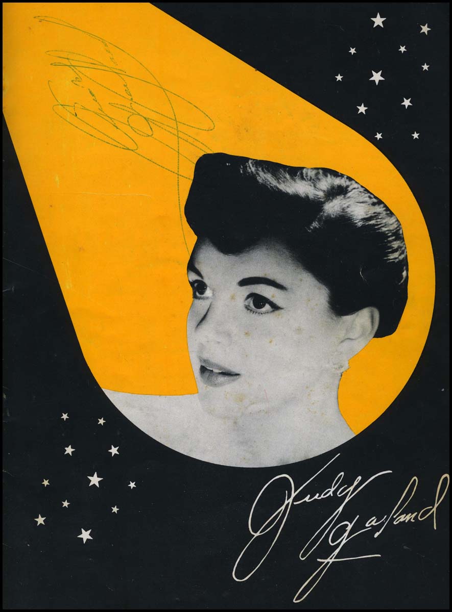 1956 Palace performance souvenir program, 9 x 12 inches, featuring images and a biography of Garland’s career, neatly signed in blue ink on the cover within the graphically striking yellow spotlight shining onto her photograph portrait. In fine condition, with some mild handling wear. Obtained in person at Garland's historic return to NY's Palace Theater.