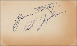 Autograph signed card. Signed "Yours Truly / Al Jolson." Toned, around edges sold with original envelope.
